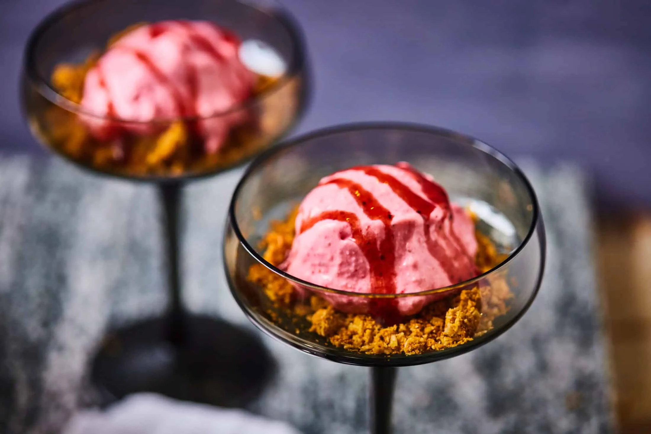 A fagyiskelyhek aljára morzsoljuk a kekszet, mehet rá a fagyi, és a tetejére csorgatunk egy kevés eperpürét.