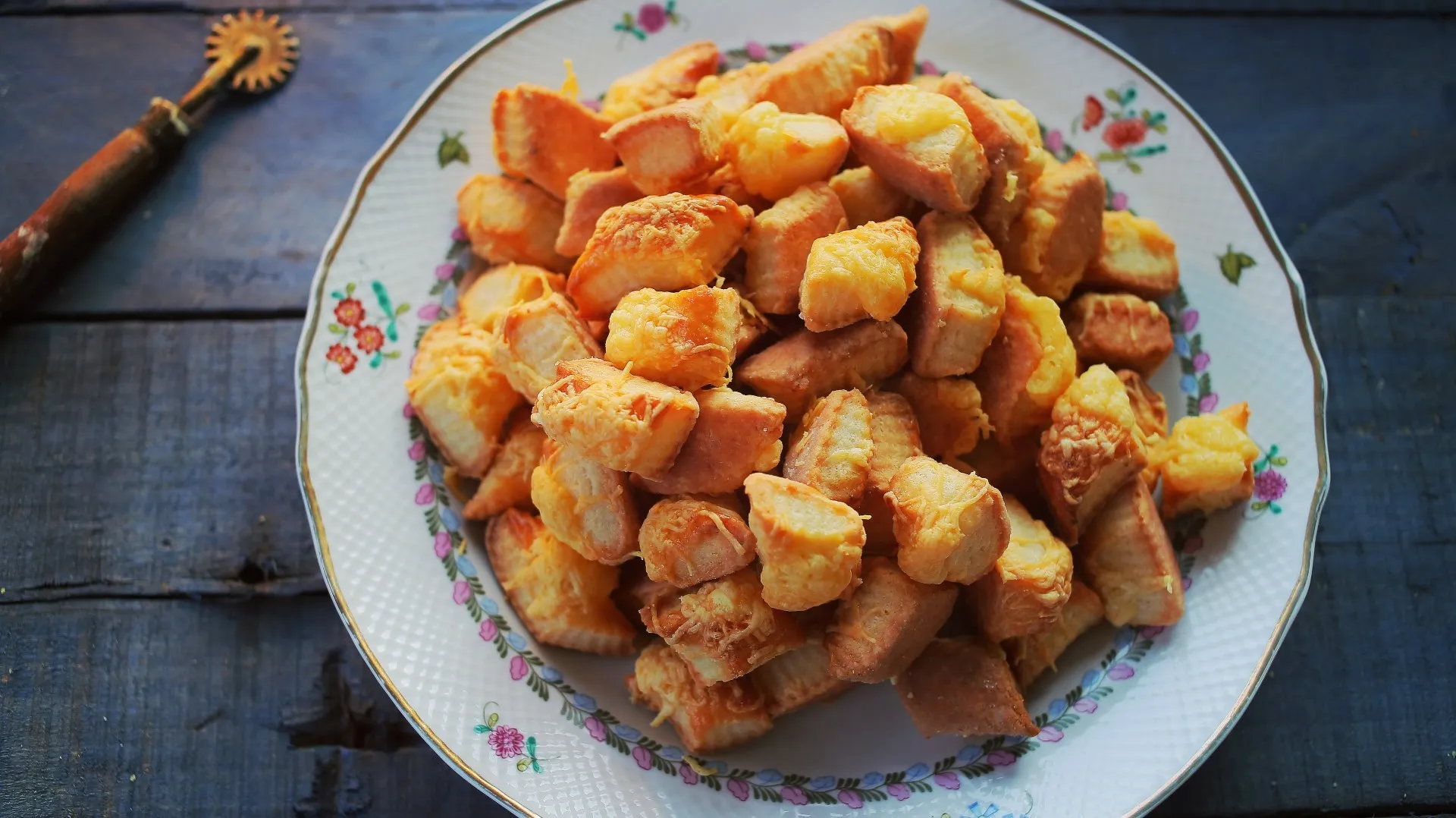 A vajat és a lisztet összedolgozzuk, majd a túrót és a sót is hozzáadva ruganyos tésztát gyúrunk. Fóliába csomagoljuk és éjszakára a hűtőbe tesszük pihenni. Másnap lisztezett deszkára borítjuk és ujjnyi (2 cm) vastagra kinyújtjuk. A teljeses felületét megkenjük kissé felvert tojással, majd derelyevágóval falatnyi darabokra vágjuk.