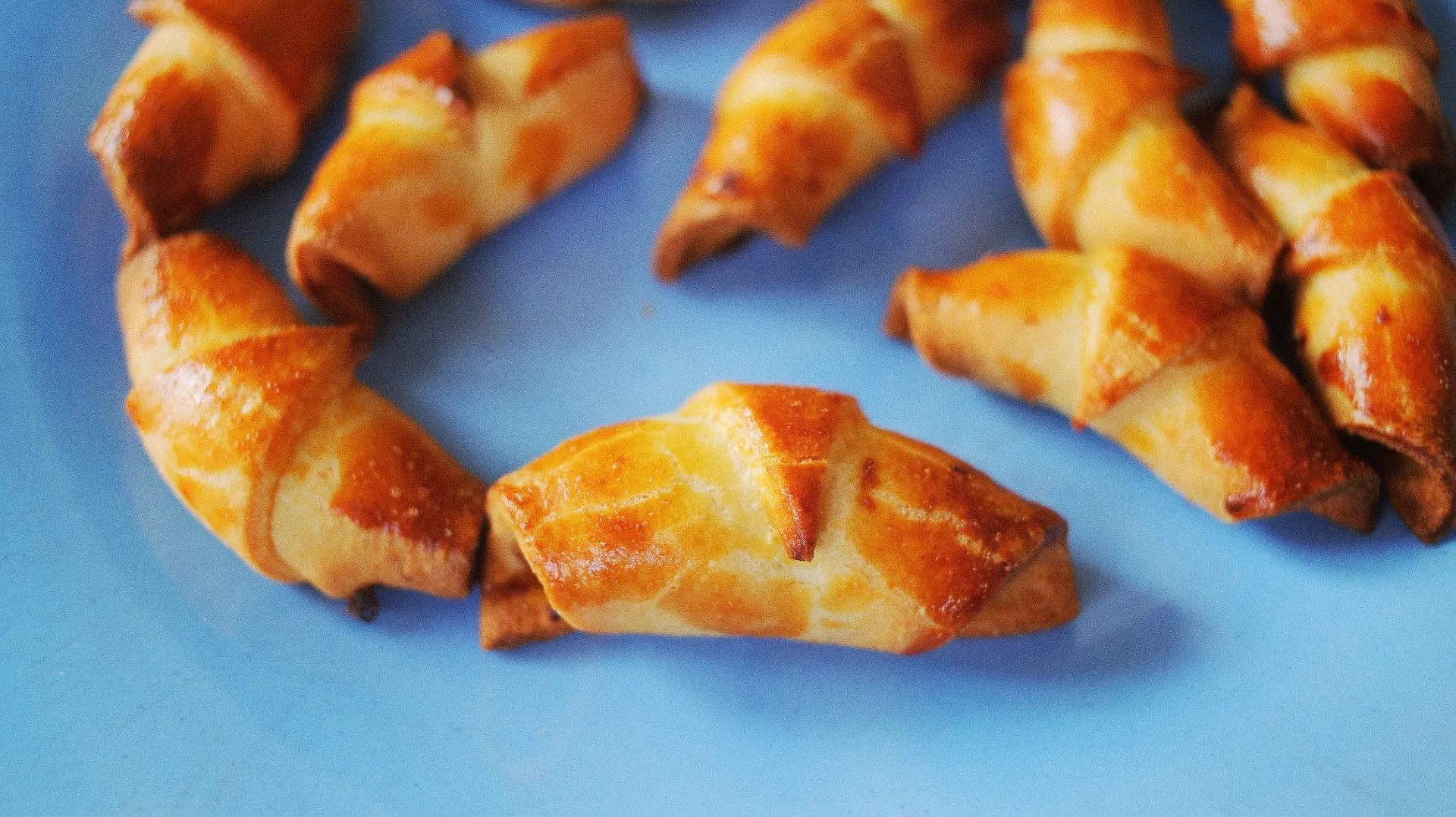 Az élesztőt a tejben felfuttatjuk 1 tk cukorral. Robotgép keverőtáljában összedolgozzuk a lisztet a puha vajjal. Hozzáadjuk a sütőport, a tojáskat, a maradék cukrot és a felfuttatott élesztőt is. Összedolgozzuk, majd kézzel is átgyúrjuk. Fóliába csomagolva éjszakára a hűtőbe tesszük. Ezután, lisztezett deszkán vékonyra (2-3 mm) nyújtjuk a tésztát és kb. 15 cm átmérőjű kör alakban kisszaggatjuk. A korongokat 8 részre vágjuk – háromszögeket kapunk. A kihűlt káposztából egy kiskanálnyit halmozunk a tésztára, feltekerjük kiflialakban és egy sütőpapírral bélelt tepsire tesszük. Megkenjük felvert tojással és 180 fokra előmelegített sütőben 15-20 perc alatt készre sütjük.