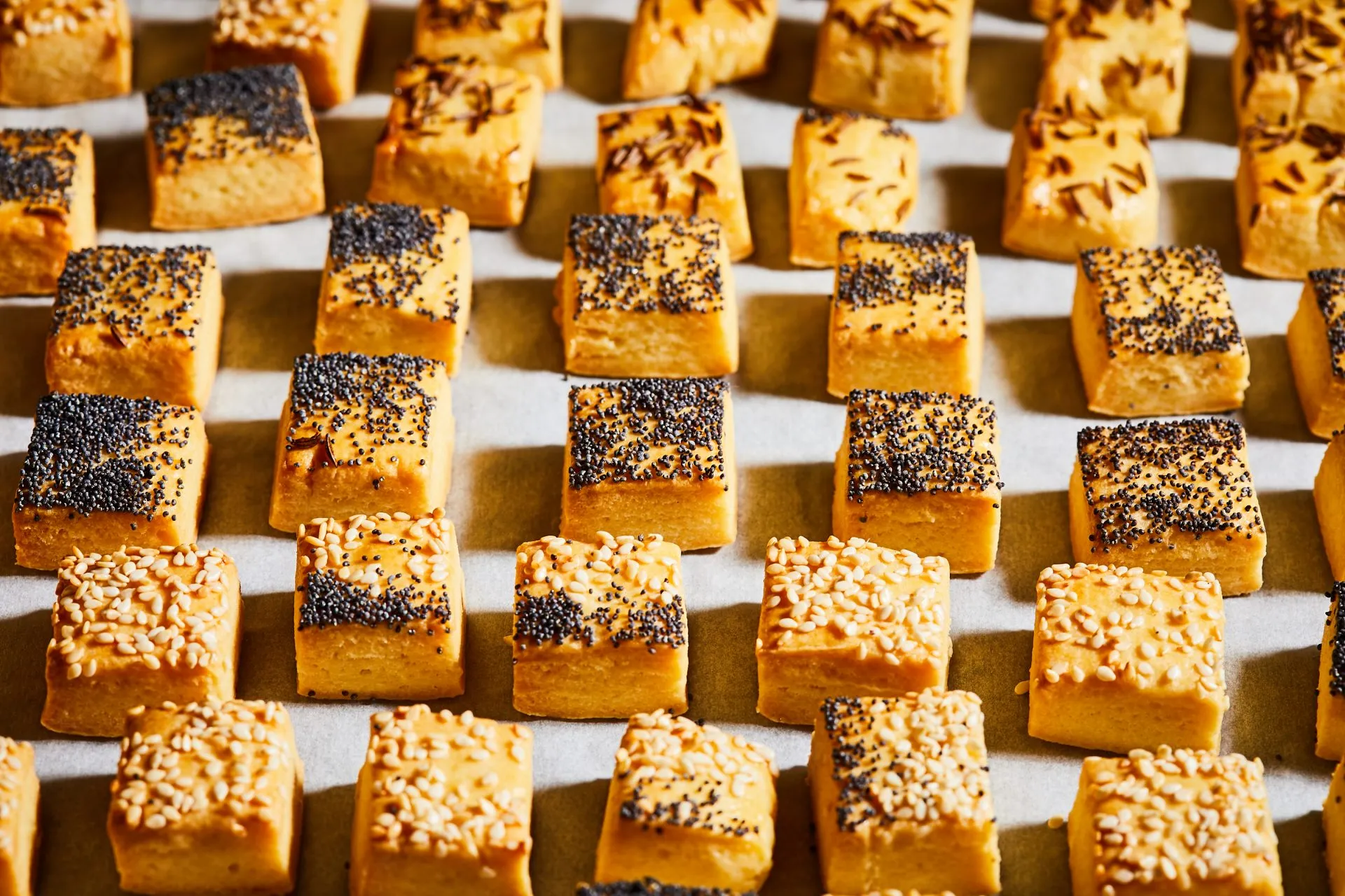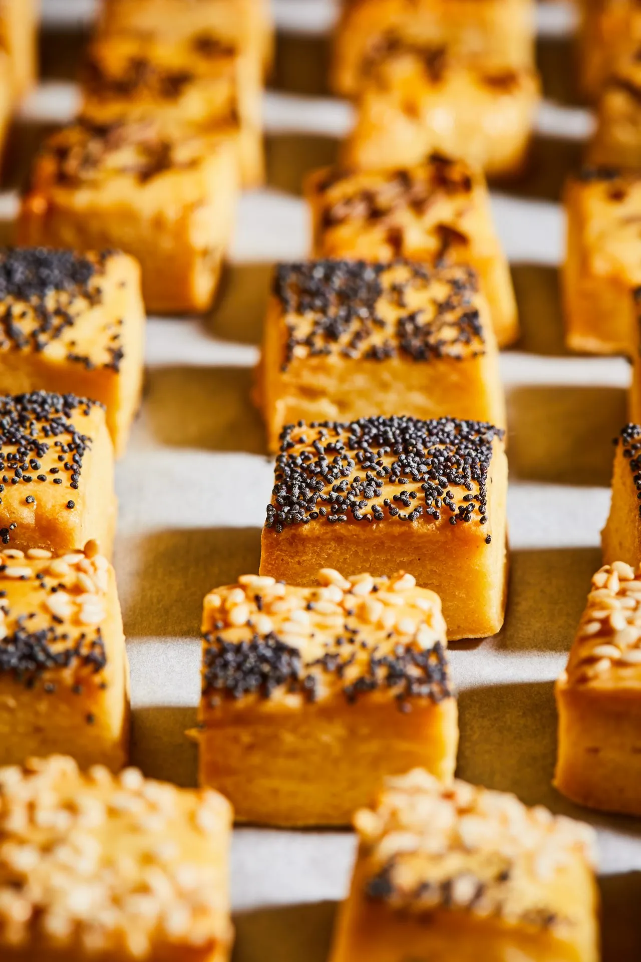 Mikor áthűlt az alap, levesszük a fóliát, lekenjük lazán felvert tojással. Megszórjuk tetszőlegesen mákkal, szezámmaggal, reszelt sajttal, köménymaggal, amivel csak szeretnénk. Kisebb, kb 1,5-2 cm-es kockákra vágjuk, majd 200 fokra előmelegített sütőben aranybarnára sütjük.