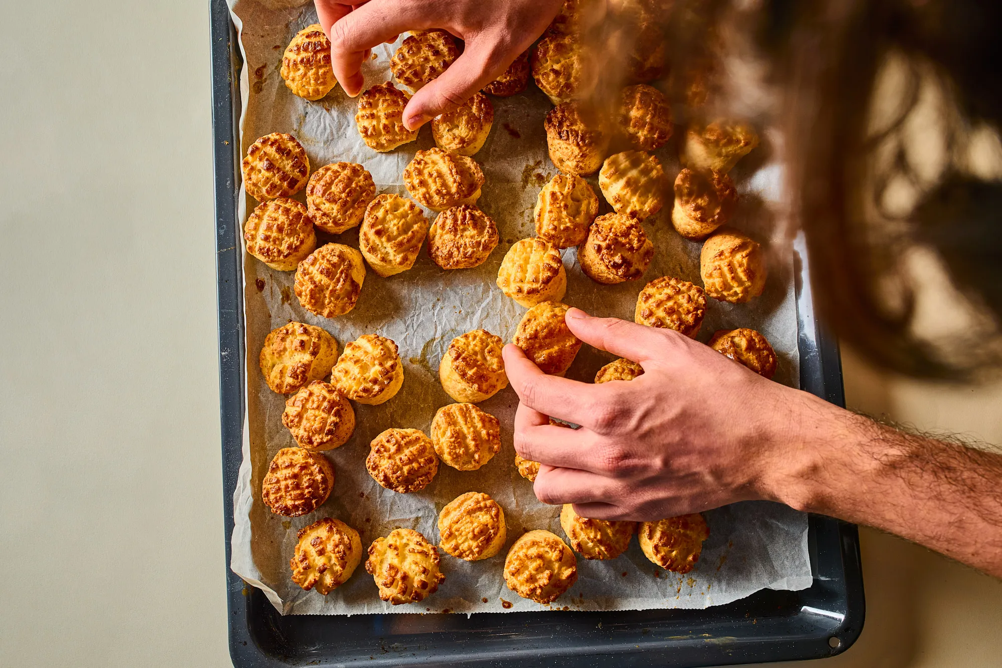 A harmadik pihenő leteltével a tésztát ujjnyi vastagra nyújtjuk, egy éles késsel berácsozzuk a tetejét, majd 3 cm átmérőjű pogácsaszaggatóval kiszaggatjuk. A pogácsákat lekenjük a felvert tojássárgájával, és 190 fokos sütőben 20 perc alatt készre sütjük.