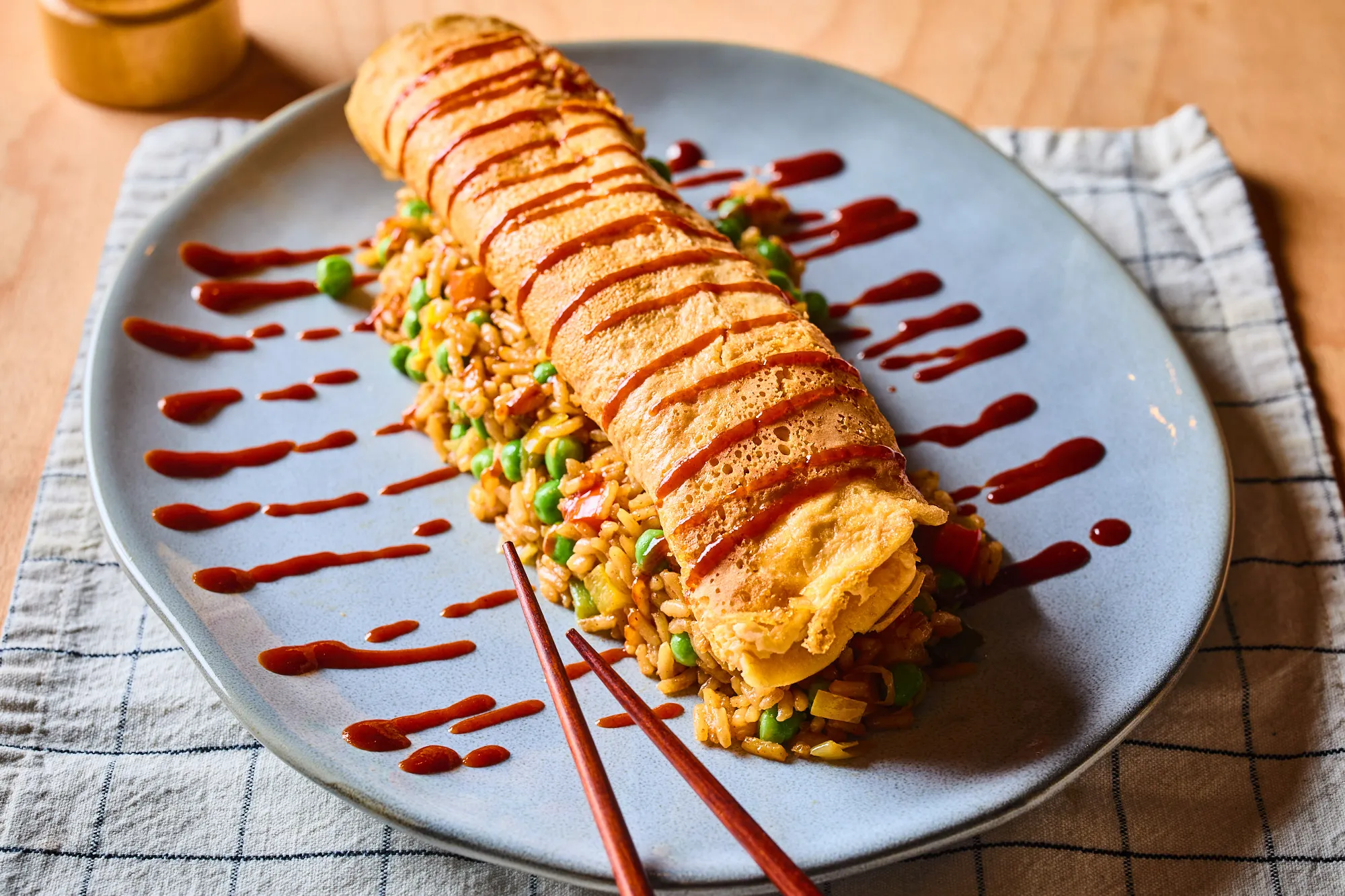 Beleöntjük a zöldborsót, majd felszeleteljük a póréhagymát és ezt is hozzáadjuk. 2 perc pirítás után belerakjuk a rizst, a maradék olajat, fűszerezzük borssal, korianderrel, szegfűszeggel és beleöntjük a szójaszószt is. Jó alaposan összeforgatjuk és pár perc alatt jól lepirítjuk. Az omletthez a tojásokat egy kis sóval felverjük. A serpenyőben felolvasztjuk a vajat és beleöntjük a tojást. Néhányszor belekeverünk, és amikor egyben összeállt óvatosan feltekerjük. A rizst a tojással tálaljuk. A mártás hozzávalóit összekeverjük és egy keveset csurgatunk a tojásos rizsre.