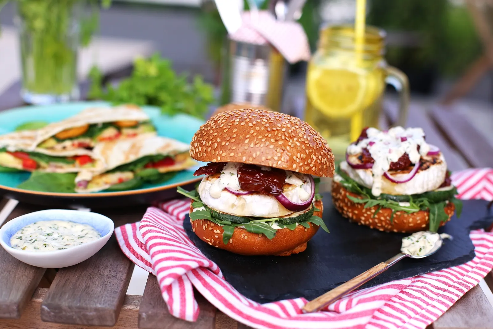 A remuládhoz apróra vágjuk az uborkát, a kaprot és a petrezselymet és egy kis tálba rakjuk őket. A vöröshagymát hozzáreszeljük és összekeverjük a többi hozzávalóval. A grillt beizzítjuk és rápakoljuk a camembert sajtokat és a kb. fél cm vastagra vágott cukkinikarikákat, majd mindkét oldalukat meggrillezzük. A zsemléket kettévágjuk, a grillre dobjuk őket a vágott felükkel lefelé és kissé megpirítjuk. A zsemlére mehet egy vékony réteg mártás, rukkola, 2-3 cukkinikarika, sajt, 1-2 aszalt paradicsom, lilahagyma, majd egy újabb adag mártás, végül a hamburgerzsömi teteje és már ehetjük is!