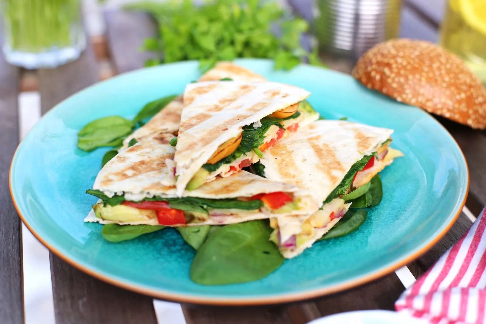 Az avokádót, a paradicsomot és a grill sajtot vékonyabb szeletekre vágjuk. A lilahagymát és a kaliforniai paprikát felkockázzuk. Az tortillalapokat megpakoljuk az avokádóval, mehet rá kevés lilahagyma és kaliforniai paprika, pár szelet füstölt sajt, paradicsomszeletek és 1-1 marék spenót. A tortillalapokat félbehajtjuk, a grillrácsra rakjuk és mindkét oldalát meggrillezzük pár perc alatt.Tipp: ha kedvünk tartja és jobban szeretjük a markánsabb ízeket, ennél a receptnél a sajtot felhasználás előtt meg is grillezhetjük és utána rakjuk a tortillalapok közé!