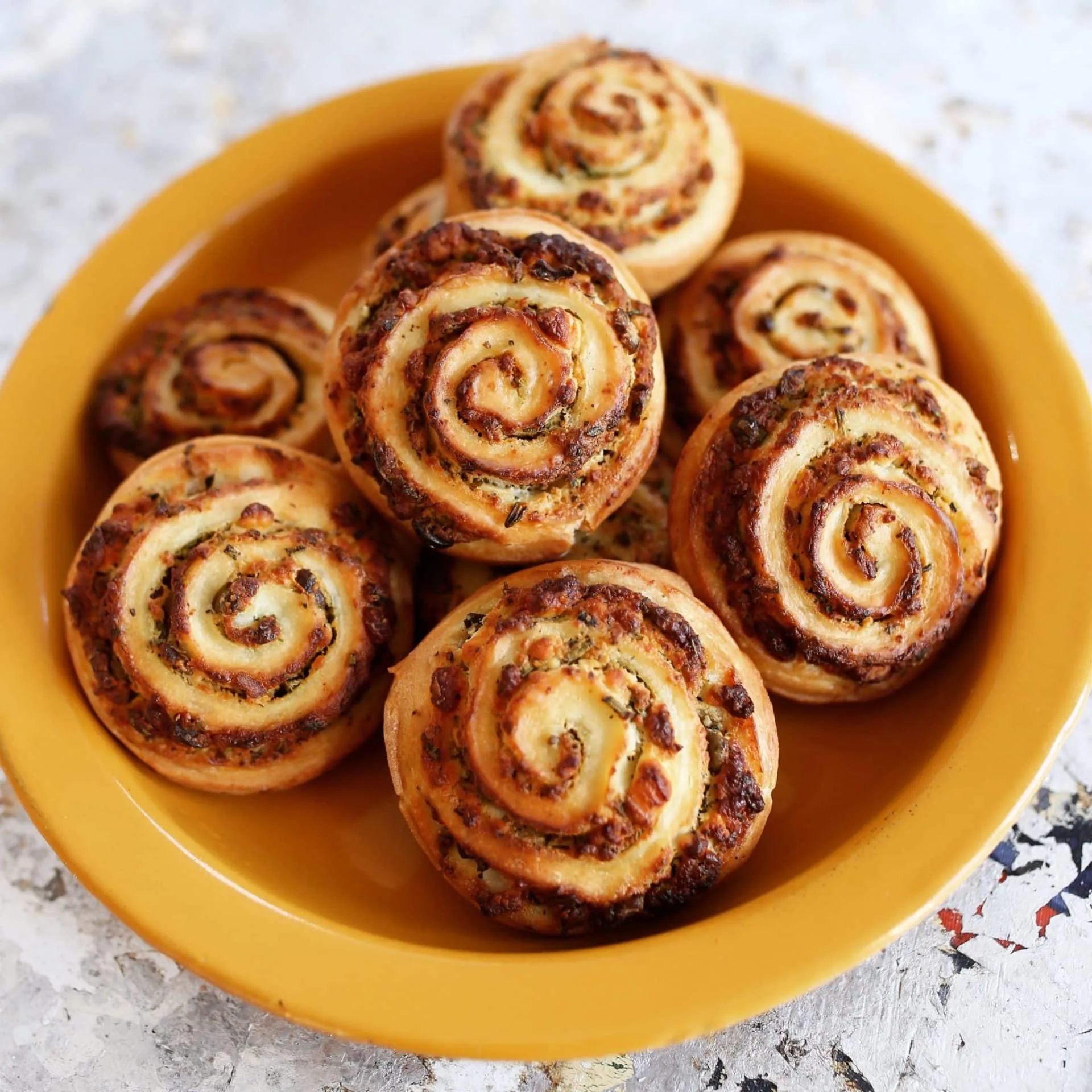 Miután megkelt a tésztánk, nyújtsuk fél cm vastagságúra, locsoljuk meg vékonyan olívaolajjal és kenjük meg a krémmel, majd hengergessük fel, ahogyan a bejglit szoktuk. Vágjuk 2 cm vastagságúra őket, majd tegyük egy sütőpapírral bélelt tepsire és süssük 200 fokon 20 percig.