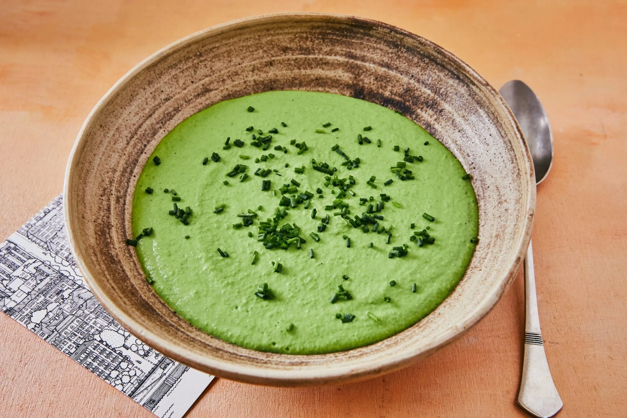 A borsópüréhez először is a fagyasztott borsót bő, sós, lobogó vízbe dobjuk. Miután újra felforrt, 5 percig főzzük, majd egy szűrőkanállal szedjük ki egy tálba (a főzővízből tegyünk félre egy keveset) és hagyjuk egy kicsit hűlni a megfőtt borsót. Friss borsóból is készíthetitek, ekkor több ideig kell főzni a borsót, míg megpuhul.