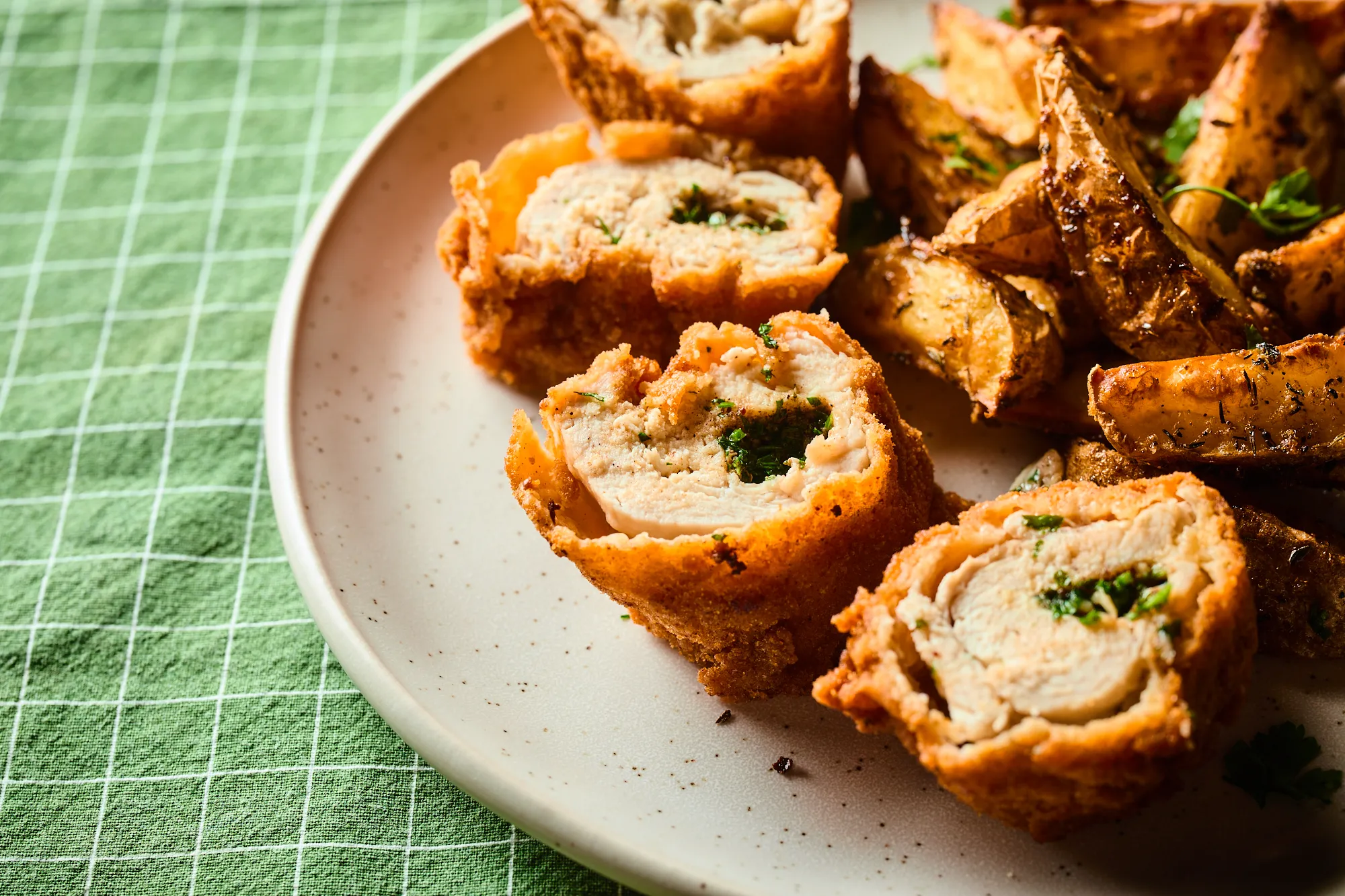 A kész kijevi csirkemelleket papírtörlőre szedjük, majd pár perc pihentetés után felvágjuk, hogy a belsejéből szépen kifolyhasson az illatos, fokhagymás vaj. Én sütőben sült krumplival tálaltam, de persze kedvünkre választhatunk hozzá más köretet is.