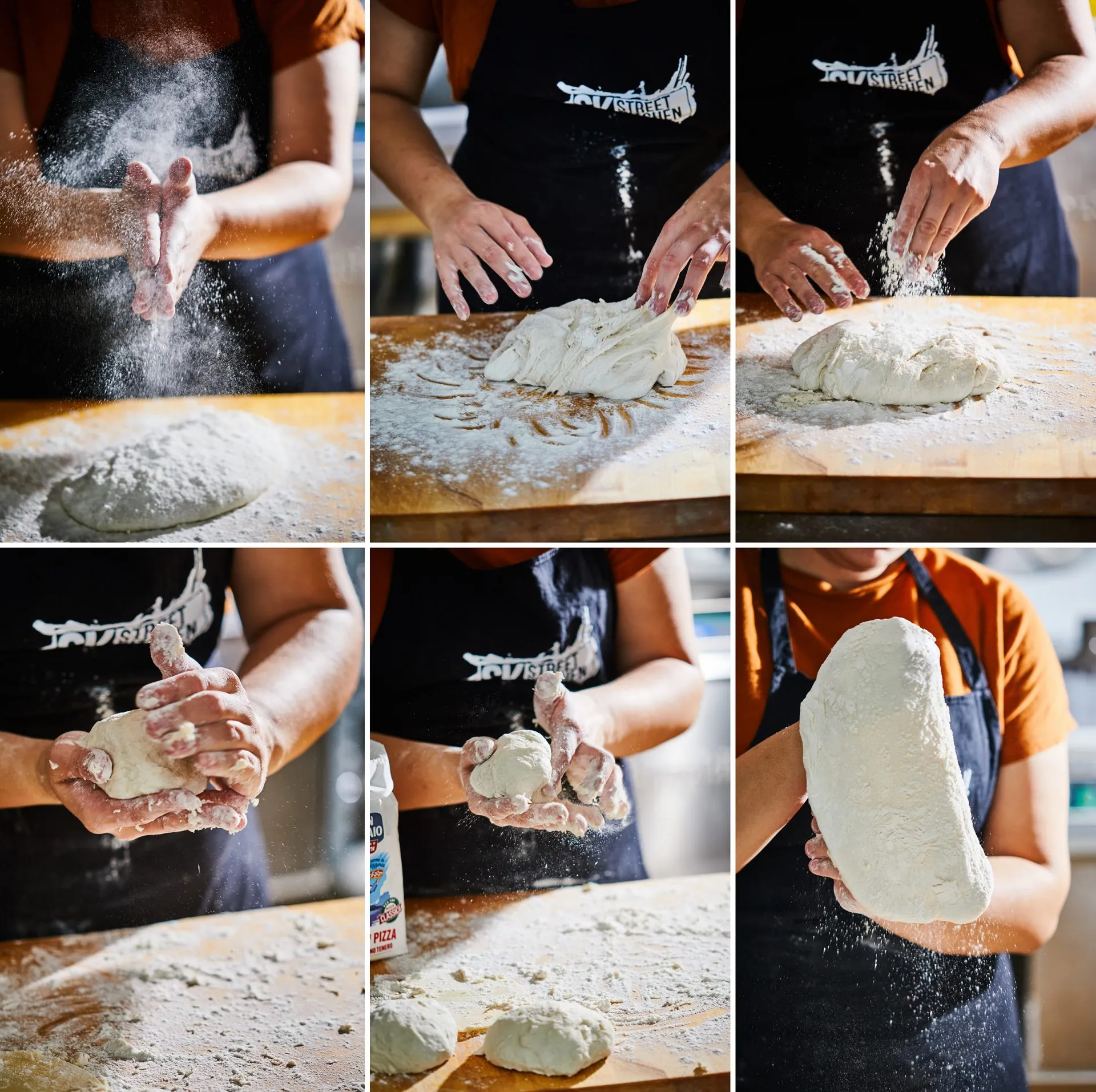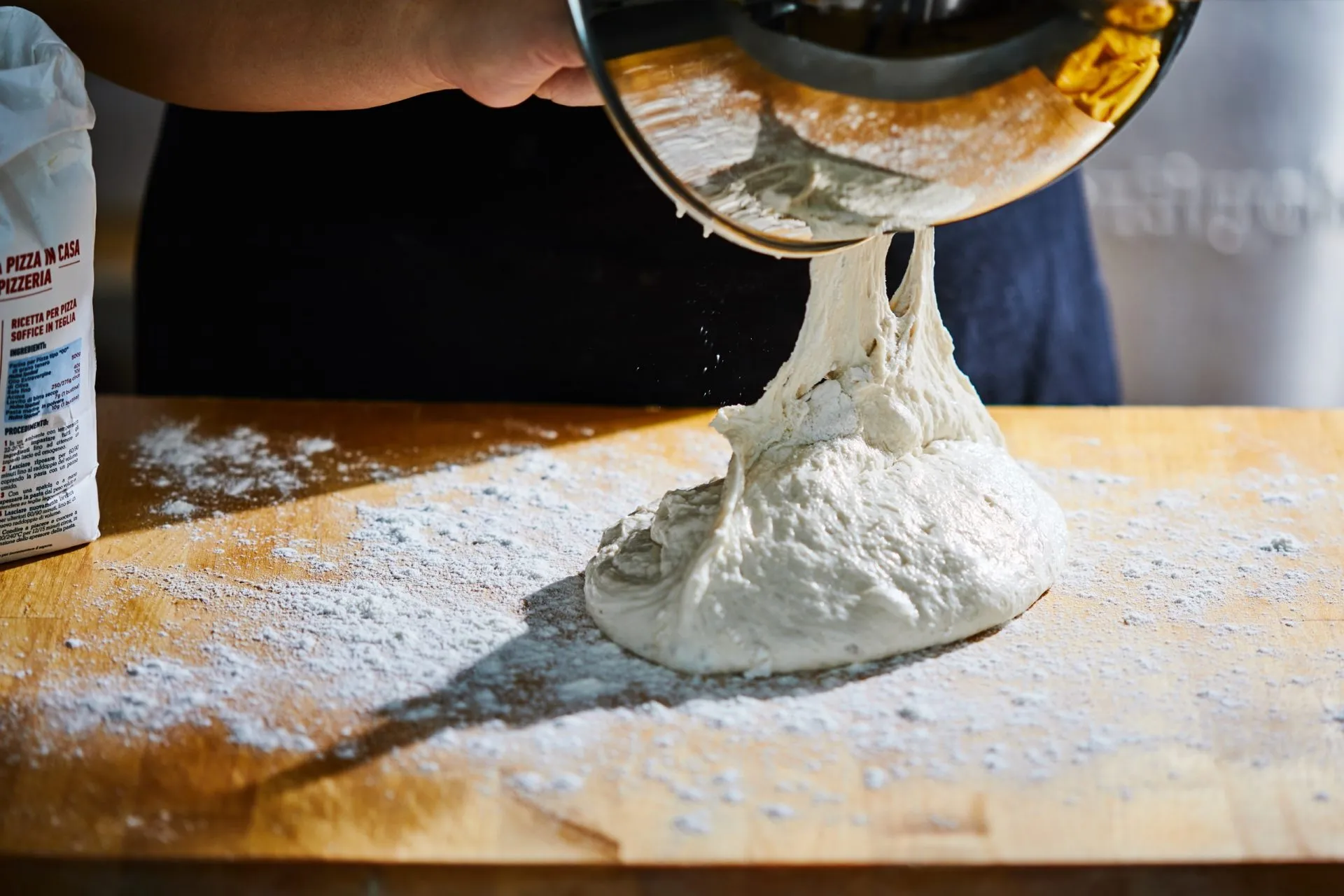 Első lépéseként egy keverőtálban feloldjuk a vízben az élesztőt, és fokozatosan belekeverjük a sóval elkevert lisztet. Ha egy kicsit összeállt a tészta, alaposan kidagasztjuk: dagasztókaros robotgéppel kb. 5-6 perc alatt, ha pedig kézzel csináljuk, akkor addig, amíg szép egyenletes nem lesz a tészta. (Elég ragadós lesz, de ez nem baj, mert a nyújtásnál sok lisztet fog felvenni.)