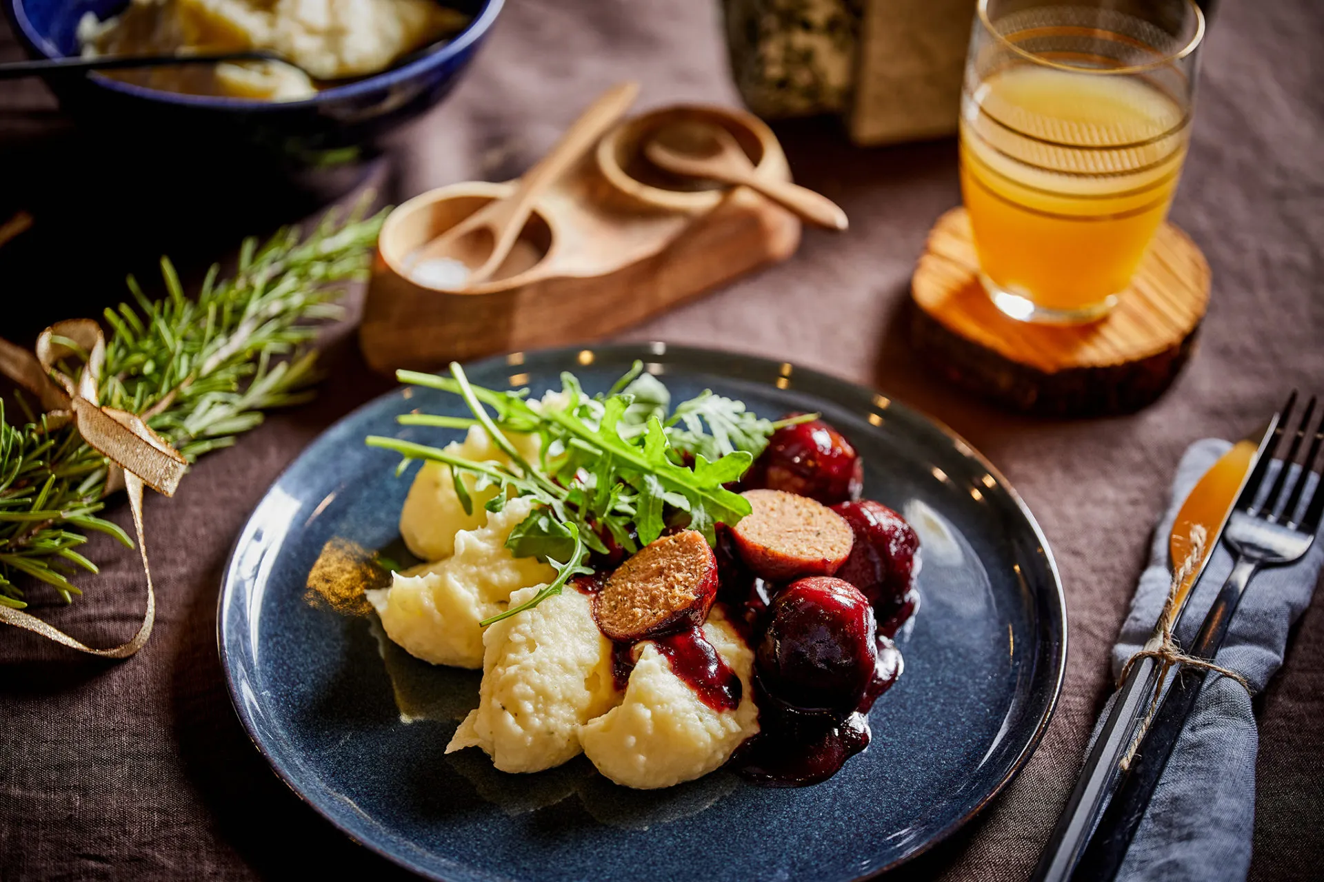 Az olívaolajat és a tejet egy tálkába öntjük, beleszórjuk a rozmaring leveleit, és 30 másodpercre a mikróba dobjuk. A zelleres krumplit leszűrjük, összetörjük, hozzáadjuk a tejes keveréket, és ízlés szerint ízesítjük még sóval, borssal, szerecsendióval. A BBQ szószos golyókat a pürével tálaljuk, végül pakolhatunk rá egy kevés rukkolát is.