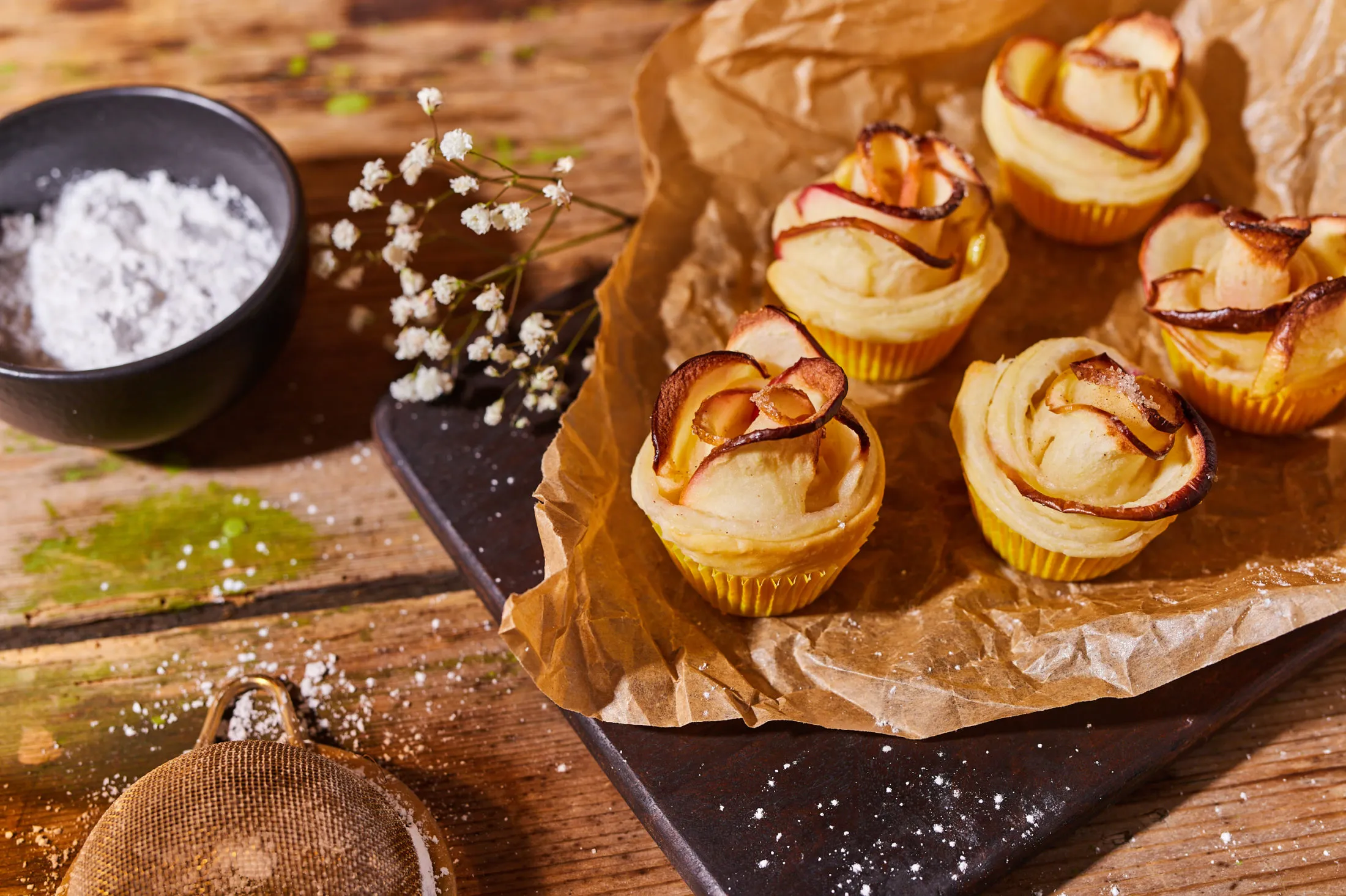 Megszórjuk a rózsákat a maradék cukorral és a fahéjjal, lekenjük a megmaradt vajjal, és 180 fokos sütőben 20 percig sütjük. Ezután lefedjük, és további 15 percig sütjük, hogy az alja is teljesen átsüljön. Tálaláskor ízlés szerint megszórhatjuk porcukorral.