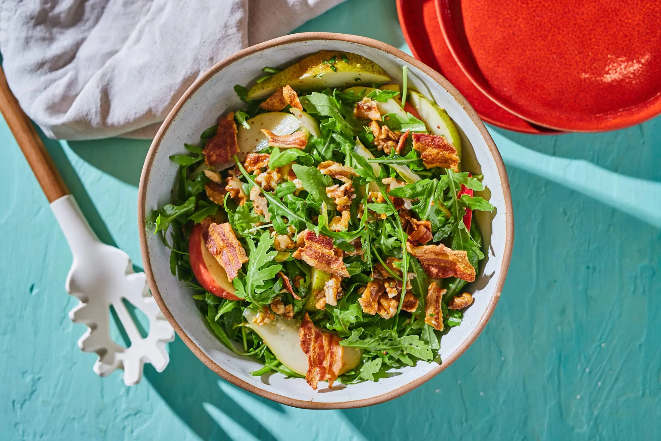 A körtét és az almát félbevágjuk, kiszedjük a magházaikat, és felszeleteljük. A diót egy száraz serpenyőben, a közepesnél kicsit magasabb lángon megpirítjuk, majd durvára vágjuk. A rukkolát egy tálba rakjuk, mehetnek rá az alma- és körteszeletek, valamint a dió és a kihűlt, kisebb darabokra tört bacon.