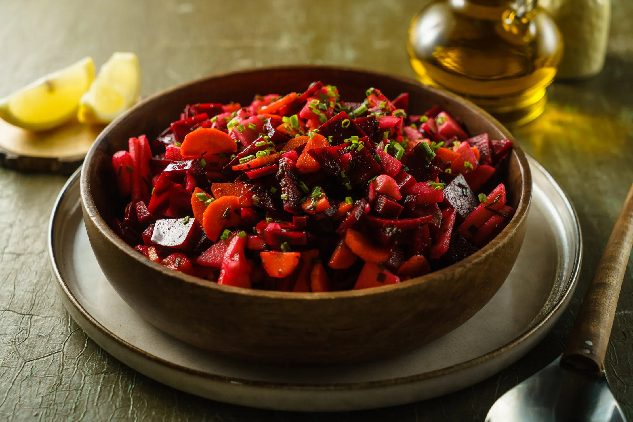 Az almás céklasaláta elkészítéséhez az almát, a céklát és a répát egyforma nagyságúra vágjuk, nálam ez most 2-3 mm vastag.