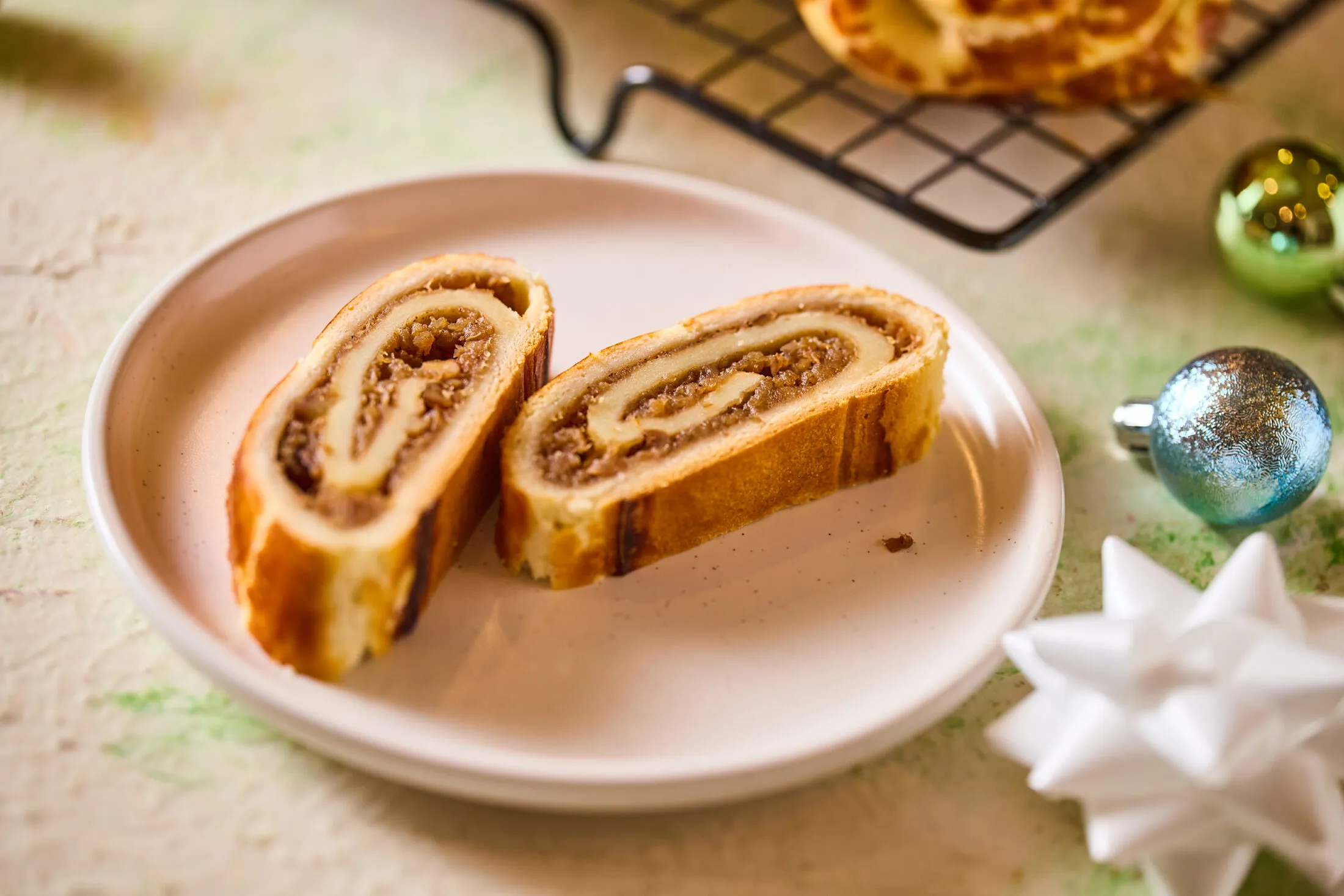 Ha minden kihűlt, a bejglitésztára vékonyan rákenjük az almás tölteléket, rászórjuk a durvára aprított karamellizált diót, majd a szélét felhajtjuk és az egészet feltekerjük. Megkenjünk tojássárgájával, majd a hűtőbe 20-30 percre visszatéve megvárjuk, hogy megkeményedjen a sárgája. Ezután lekenjük a tojásfehérjével, és ismét 20-30 percet hagyjuk száradni a hűtőben. Egy hústű segítségével megszurkáljuk a tetejét, és 180 fokra előmelegített sütőben 40 perc alatt készre sütjük.
