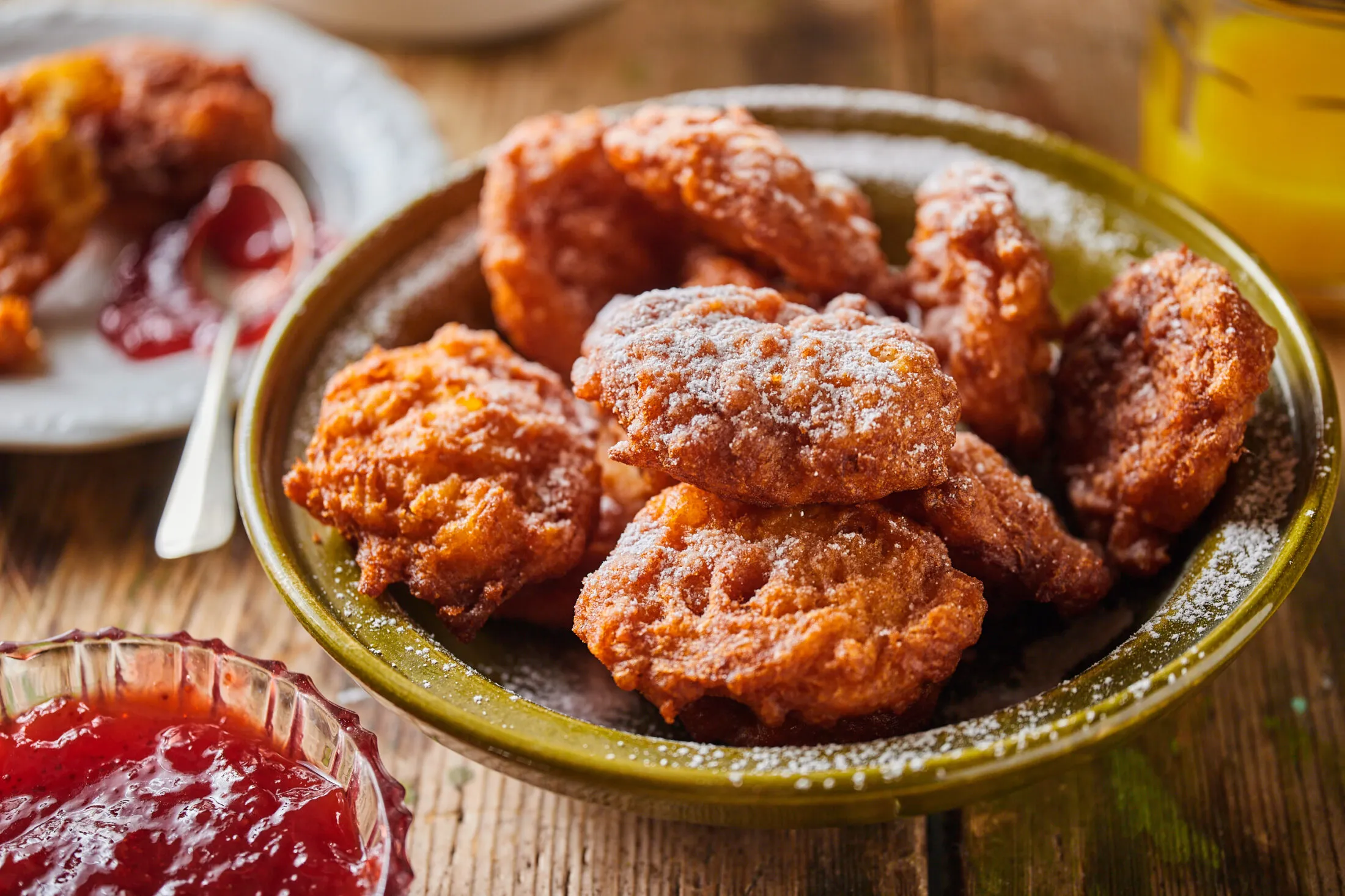 Tálalásnál a frissen sült puffancsokat meghintjük porcukorral, és eperlekvárt kínálunk melléjük.