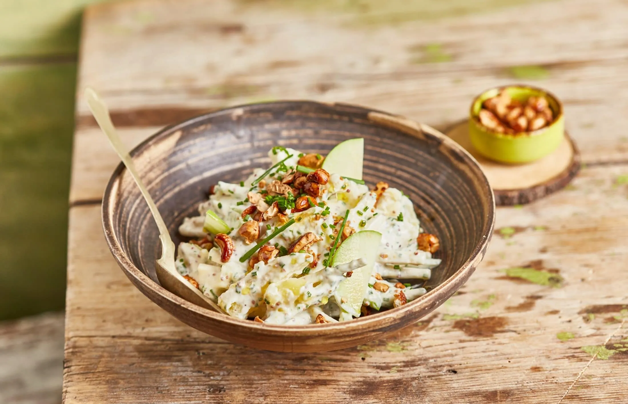 Az eddig elkészített alapanyagokat összekeverjük, majd tálalásnál megszórjuk a salátát a mézes, pörkölt kesudióval.