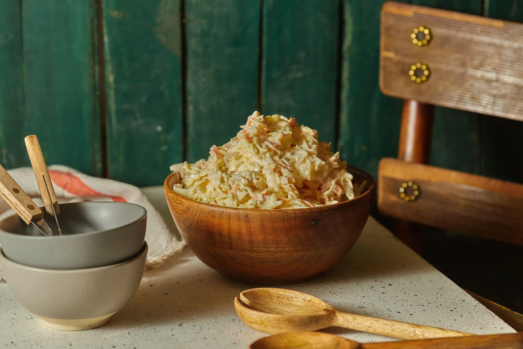 Az amerikai káposztasaláta elkészítésének első lépéseként a káposztát egy éles késsel nagyon vékonyan felszeleteljük, a répát kis lyukú reszelőn lereszeljük, és a zöldségeket egy tálba tesszük. Lesózzuk, átkeverjük és hagyjuk 10 percet állni, majd jó alaposan kinyomkodjuk és átmossuk. Egy tálban összekeverjük a tejfölt, a majonézt, a mustárt és a porcukrot, megborsozzuk és hozzákeverjük a kinyomkodott káposztát és répát. Megkóstoljuk, és ha szükséges, beállítjuk a sósságát. Hidegen, húsok mellé tálaljuk.