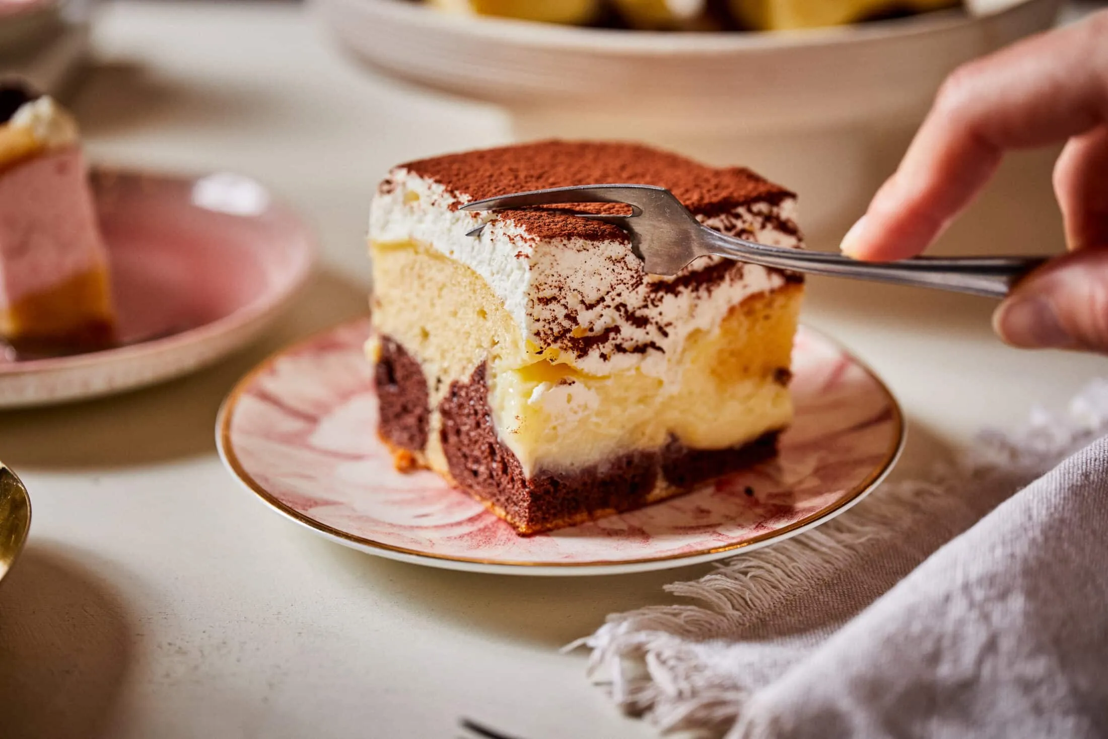 Végül a habtejszínt a cukorral és a habfixálóval kemény habbá verjük, rákenjük a sütemény tetejére, és megszórjuk kakaóporral, majd tetszés szerint felvágjuk.