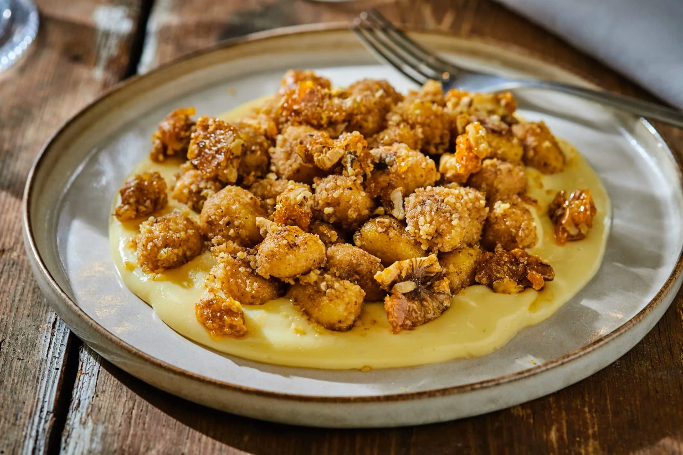 A pudingból még melegen öntünk egy tányérba, rászedjük a gnocchit és a tetejére tördeljük a karamellizált diót.
