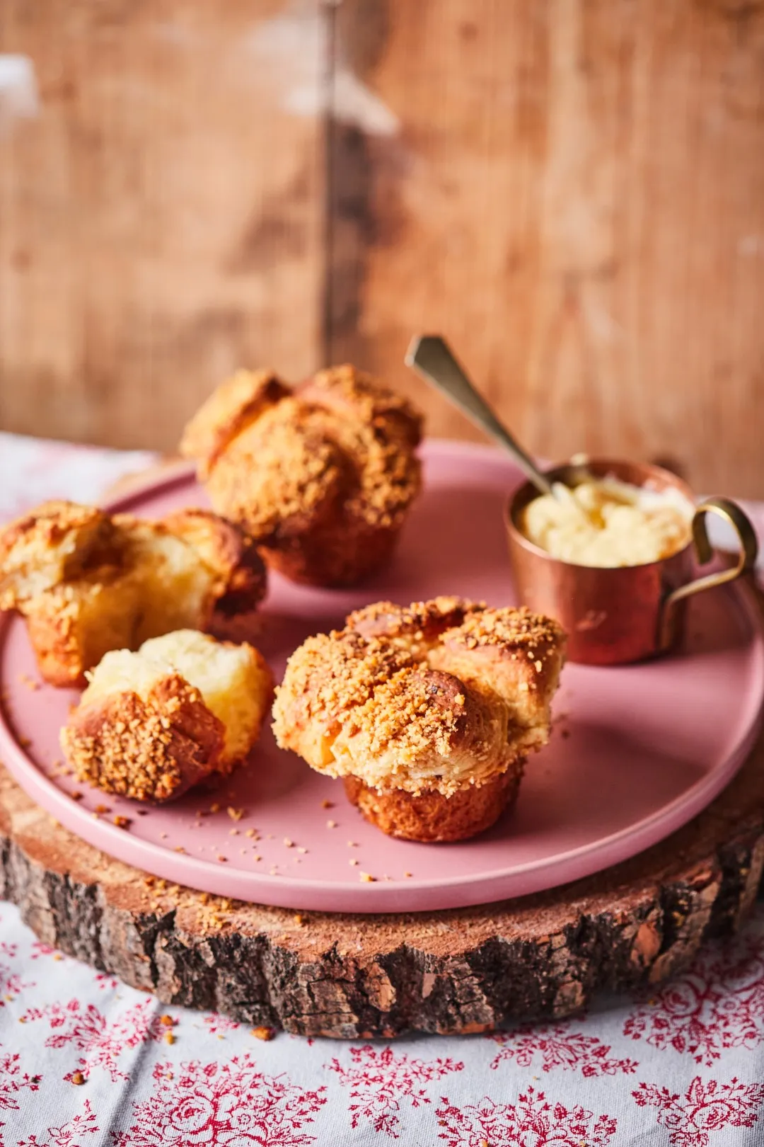 Kisebb méretű (kb. 3-4 cm átmérőjű) pogácsaszaggatóval kis korongokat vágunk ki belőle. Addig gyúrjuk és szaggatjuk újra, amíg az összes tészta el nem fogy. Egy normál, 12 darabos muffin tepsi 9 mélyedését kivajazzuk és kilisztezzük. A formák legaljára 3 kis korongot rakunk, úgy, hogy egy kicsit fedjék egymást.