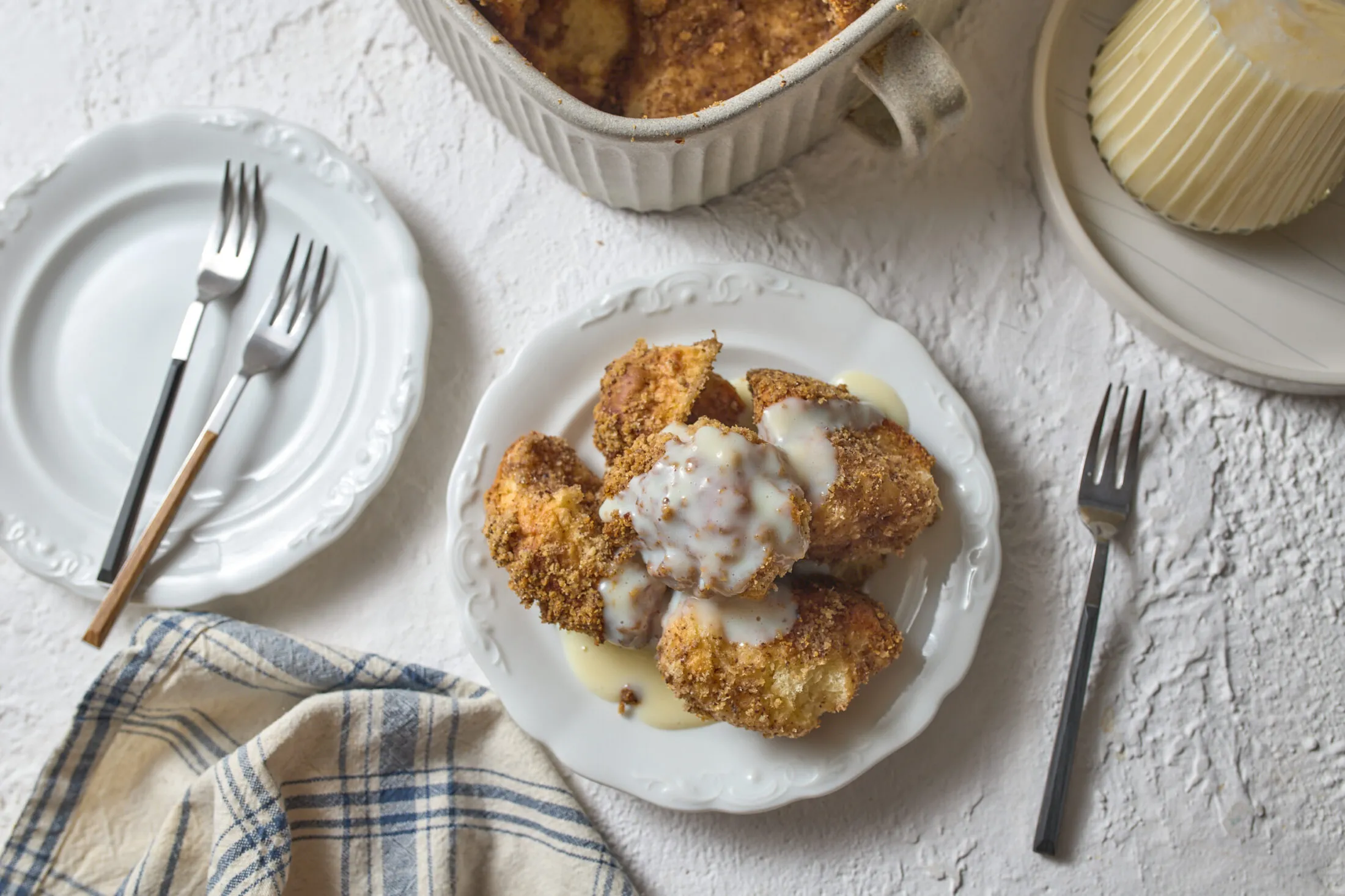 A cukrot összekeverjük a darált dióval. A megkelt tésztát kb. 2 cm vastagságúra nyújtjuk enyhén lisztezett felületen, majd fánkszaggatóval félhold alakokat vágunk ki belőle, amiket belemártunk az olvasztott vajba és meghempergetünk a cukros dióban. Egy kivajazott sütőformába rétegezzük a tésztát, és legalább 3 rétegben pakoljuk egymásra a galuskákat.