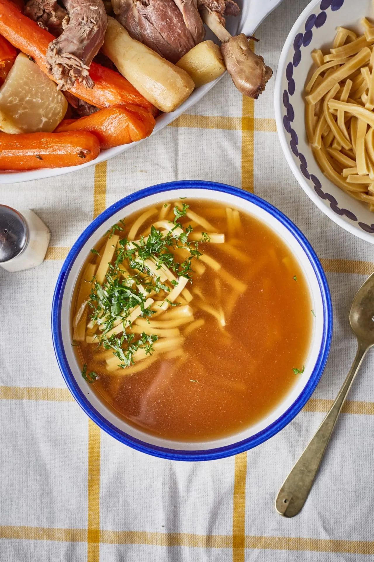 Az kacsarészeket, a szemes borsot, a hagymát, a vizet és a fokhagymát egy nagy fazékba tesszük, ízlés szerint sózzuk, majd gyöngyözve főzzük 3-4 órán át, néha lehabozva a tetejét. A 3-4 óra letelte után beletesszük a zöldségeket, és addig főzzük gyöngyözve, amíg meg nem főttek, ez kb. 1 óra. A levesből óvatosan kiszedjük a zöldségeket és a húst, majd egy sűrű szövésű szűrőn és tiszta konyharuhán keresztül leszűrjük a levest.