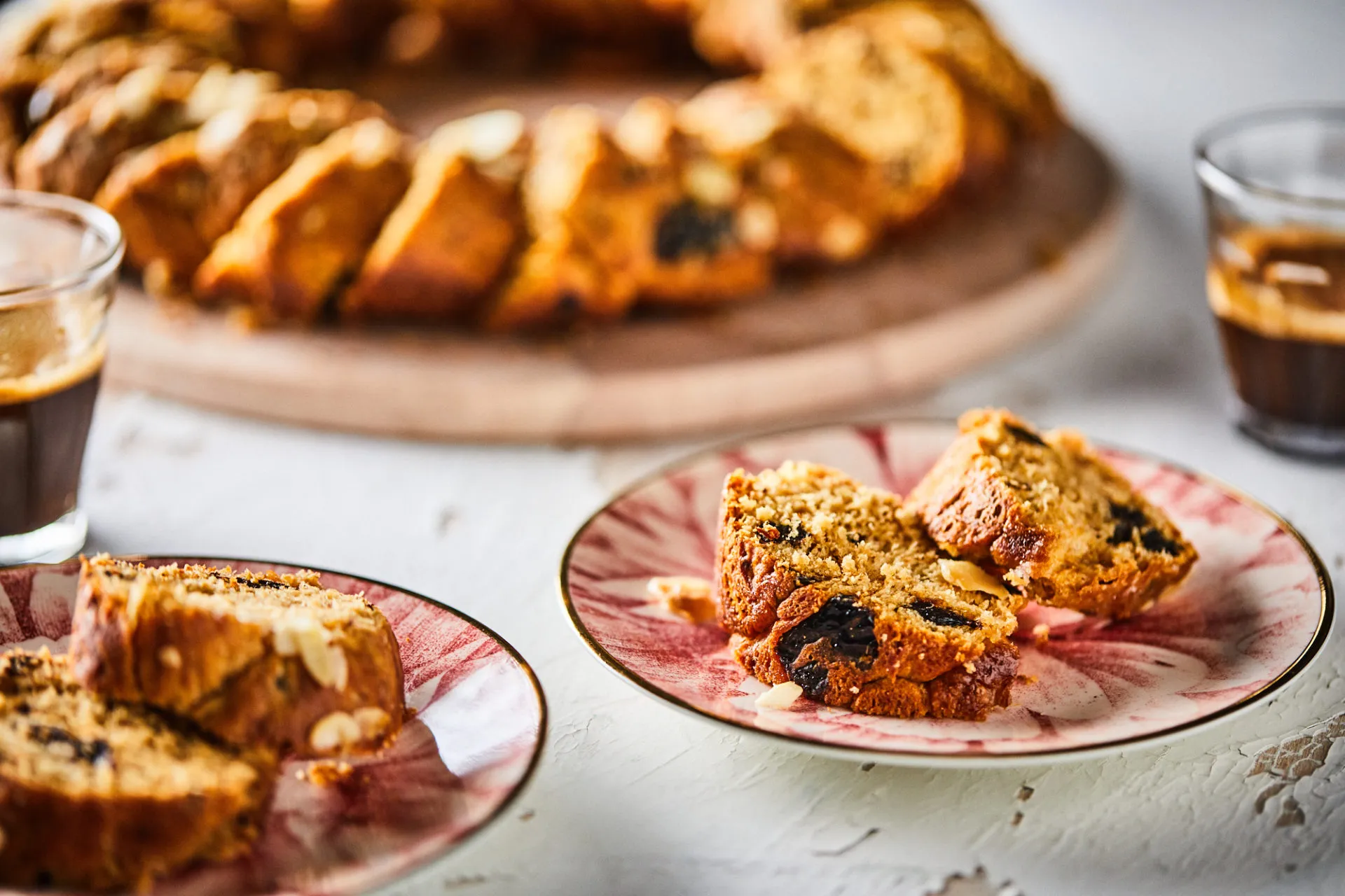 Ha megkelt, deszkára borítjuk, 2 gombócot formázunk belőle, majd kb. 50 cm hosszú rudakat sodrunk, amiket összetekerünk. Enyhén kivajazzuk a formát, belerakjuk a tésztát, a végeit összenyomjuk, és lefedve további 30 percig kelesztjük. Megszórjuk a szeletelt mandulával, és 180 fokra előmelegített sütőben 20-25 perc alatt megsütjük. Pár percig hagyjuk hűlni.