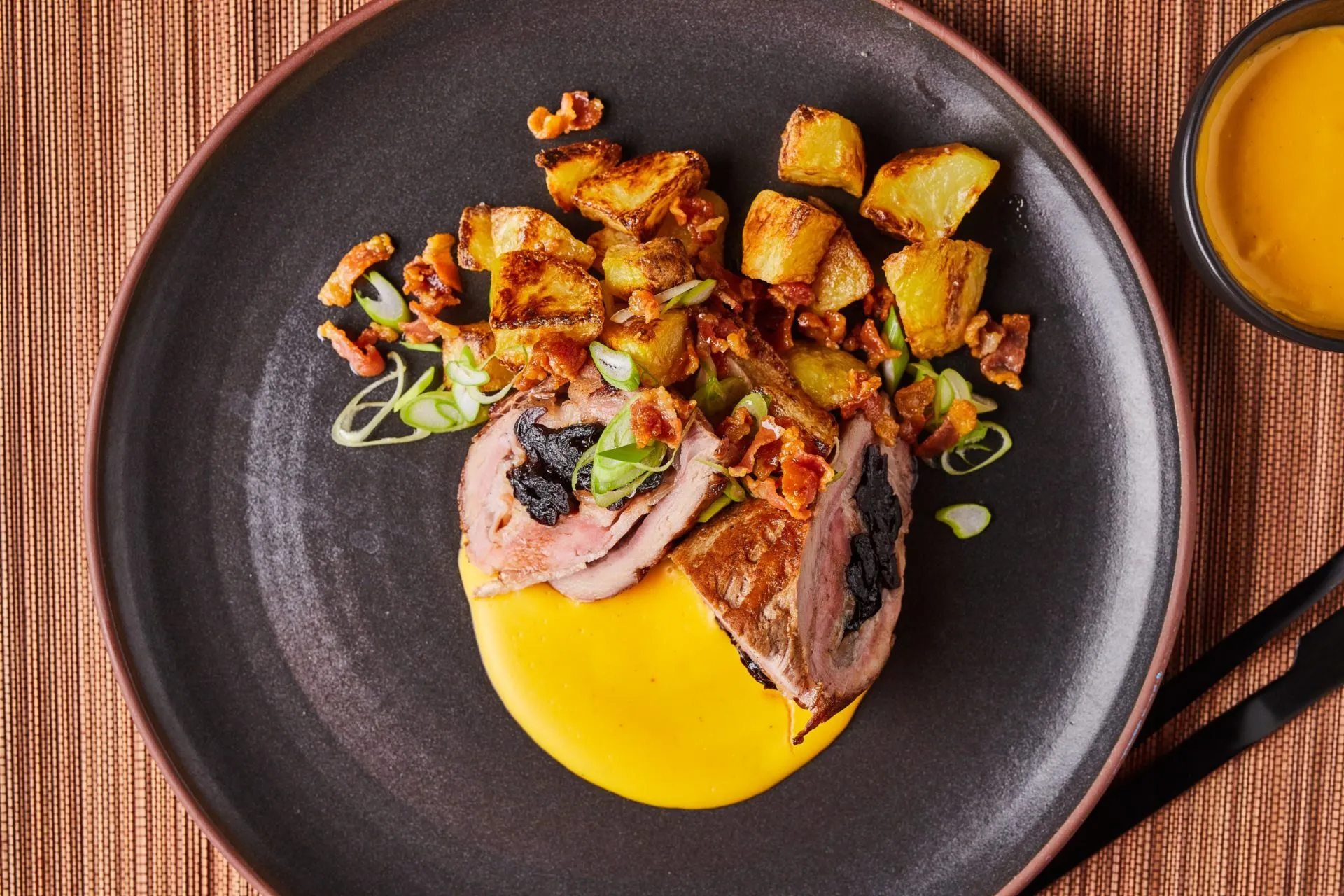 Tálaláskor a tányérra szedünk a sajtmártásból, arra helyezzük a felszeletelt húst, mellé szedünk a sült krumpliból, megszórjuk a pirított baconnel és a karikára vágott újhagymával.