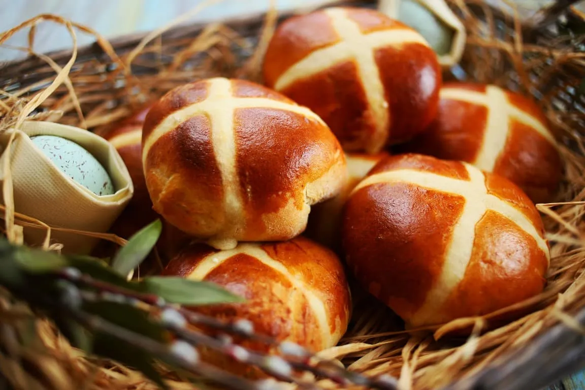 Közben kiolajazunk egy tálat, beletesszük a tésztát, leolajazzuk a tetejét, folpackkal letakarjuk és 1 órán keresztül kelesztjük. Kinyomkodjuk belőle a légbuborékokat, lisztezett felületen késsel 10 részre vágjuk. Kinyújtjuk, a közepébe 1 evőkanálnyi mogyorókrémet teszünk, a széleit összecsípjük, csípéssel lefele sütőpapírral bélelt tepsire tesszük, folpackkal letakarjuk és 30 percig kelesztjük. Tetejüket tojássárgás tejjel lekenjünk. A lisztet a vízzel csomómentesre keverjük, habzsákba töltjük és a zsömlék tetejére kereszteket rajzolunk. Gőzös funkción 190 fokos sütőben 15-20 perc alatt aranybarnára sütjük. Ha nincs ilyen opciónk, alulra tegyünk egy vízzel teli tepsit.