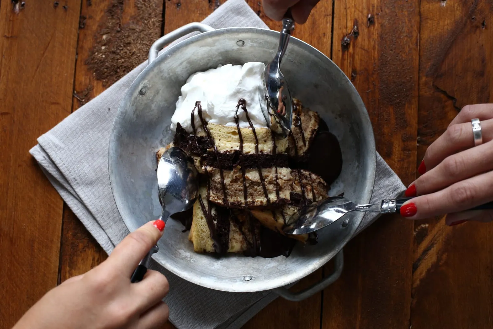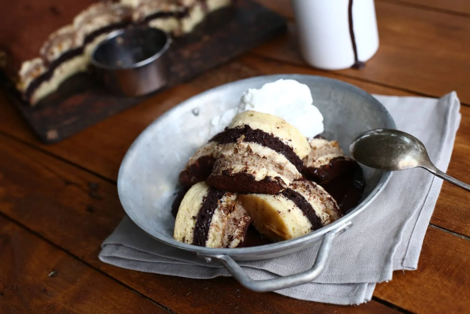 A vaníliás krémhez a tejet 50-60 fokosra melegítjük, a tojássárgákat pedig kikeverjük a cukorral, hozzáadjuk a vaníliarudak kikapart magját, majd egészen habosra keverjük egy üstben. Az üstöt vízgőz fölé rakjuk, folyamatosan adagolva hozzáöntjük a meleg tejet, több részletben hozzászitáljuk a lisztet, és habverővel folyton kevergetjük, míg besűrűsödik (kb. 15 perc). A tojásfehérjét közben kemény habbá verjük, és befejezésül a gőzről levett forró krémhez keverjük. A csokoládéöntethez egy edényben összekeverjük a kakaóport a vajjal és a cukorral, hozzáadjuk a vizet, és amikor alacsony hőmérsékleten melegítve, folyamatos kevergetés mellett fényes mártást kapunk, hozzáadjuk a rumot is. A diót durvára vágjuk, és száraz serpenyőben lepirítjuk.