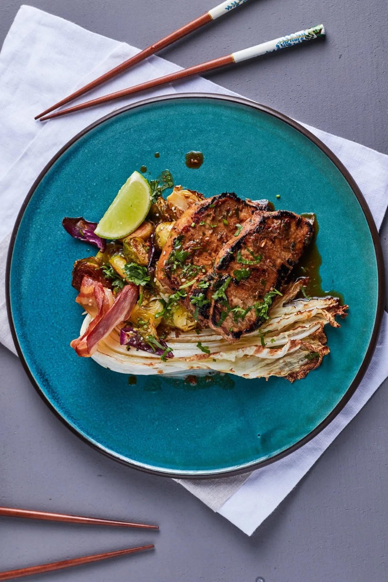 Amíg a köretünk sül, a húsunkat egy tapadásmentes serpenyőben, magas hőfokon kérgesítjük, majd egy tepsibe helyezzük, és a köret mellett, a karaj méretétől függően 10-15 perc alatt készre sütjük. Friss korianderrel és lime-cikkel tálaljuk.