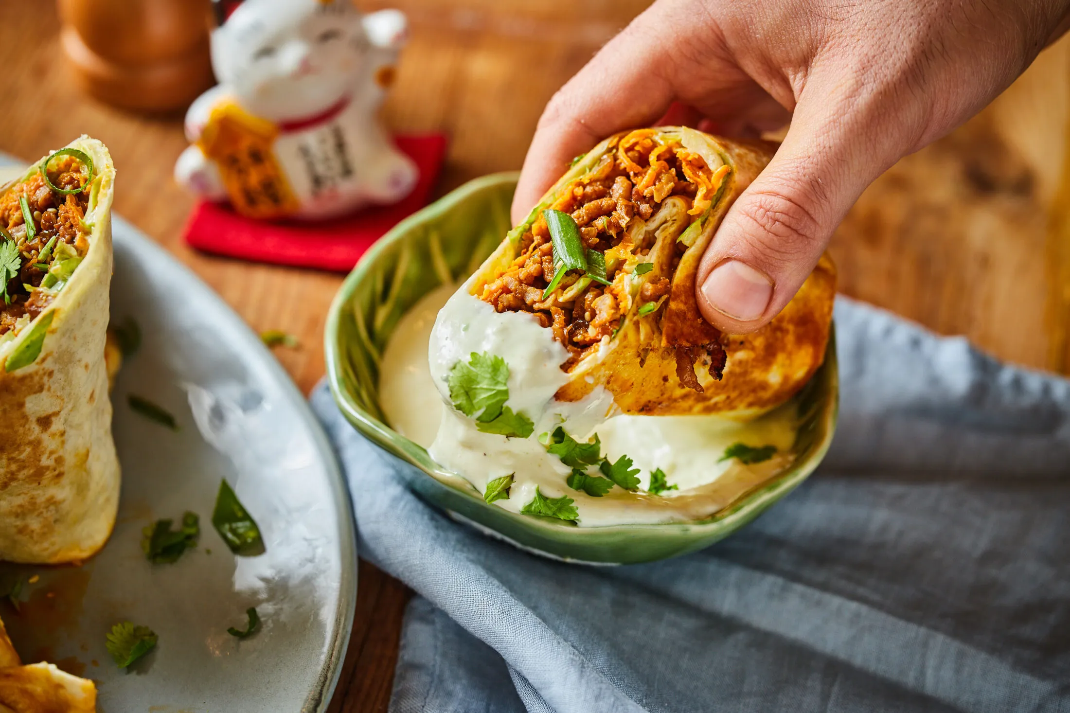 Jöhet az összeállítás! A tortillalapokat megkenjük a wasabis majonézzel, mehet rá a vékonyra vágott jégsaláta, a reszelt répa, a darált húsos ragu, a felkarikázott újhagyma és egy kevés koriander. A wrapeket szorosan feltekerjük, majd egy serpenyőben körbepirítjuk őket tálalás előtt.