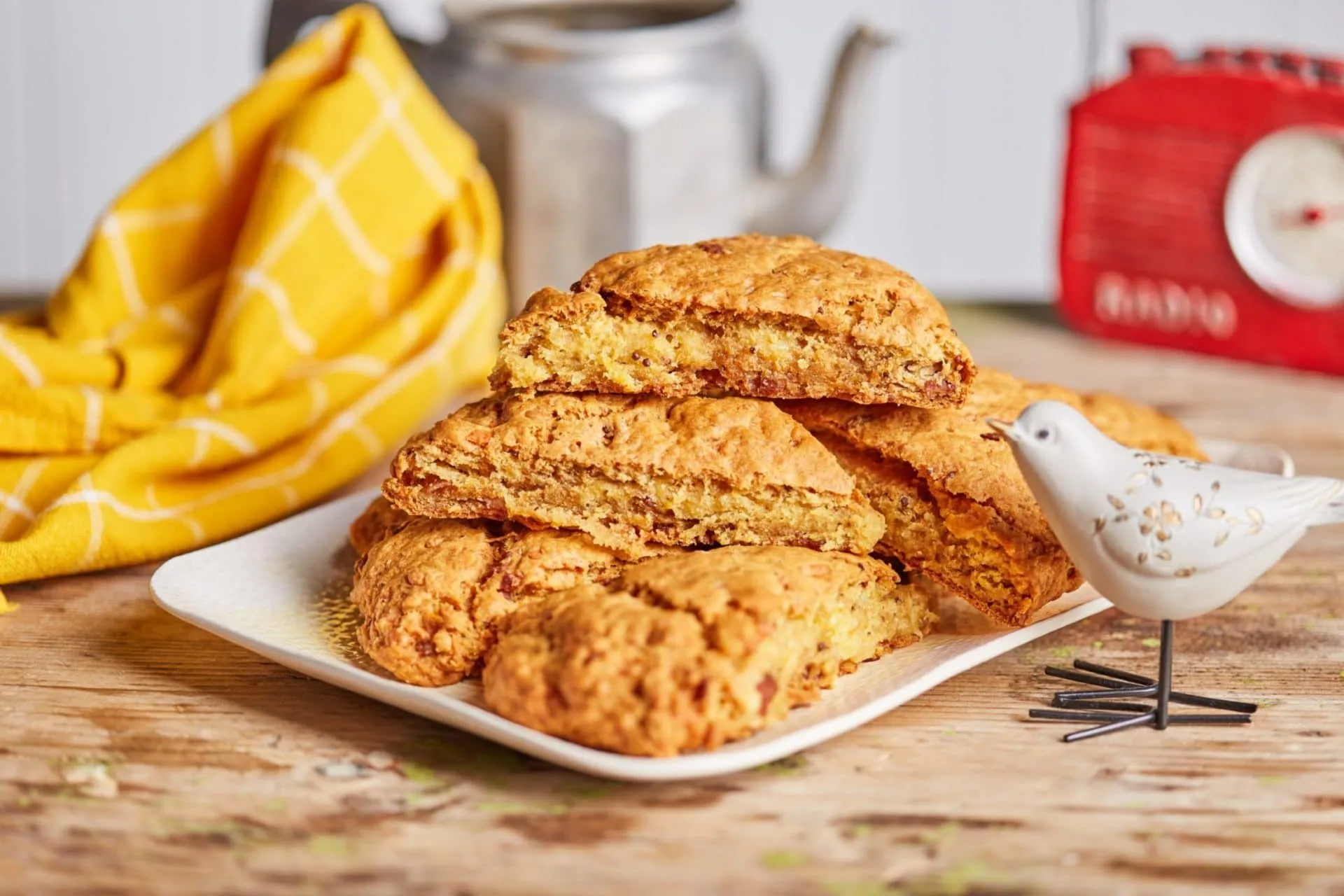 A bacont kis kockákra vágjuk, és egy száraz serpenyőben lepirítjuk, majd félrerakjuk. A cheddart lereszeljük, összekeverjük a liszttel és a sütőporral, majd beledolgozzuk a vajat, a tojásokat, a tejet, a sót, a borsot és a magos mustárt is. Belekeverjük az apróra vágott bacont, átgyúrjuk a tésztát, egy kb. 20 cm átmérőjű korongot formázunk belőle, sütőpapíros tepsire rakjuk, és 180 fokra előmelegített sütőbe toljuk.