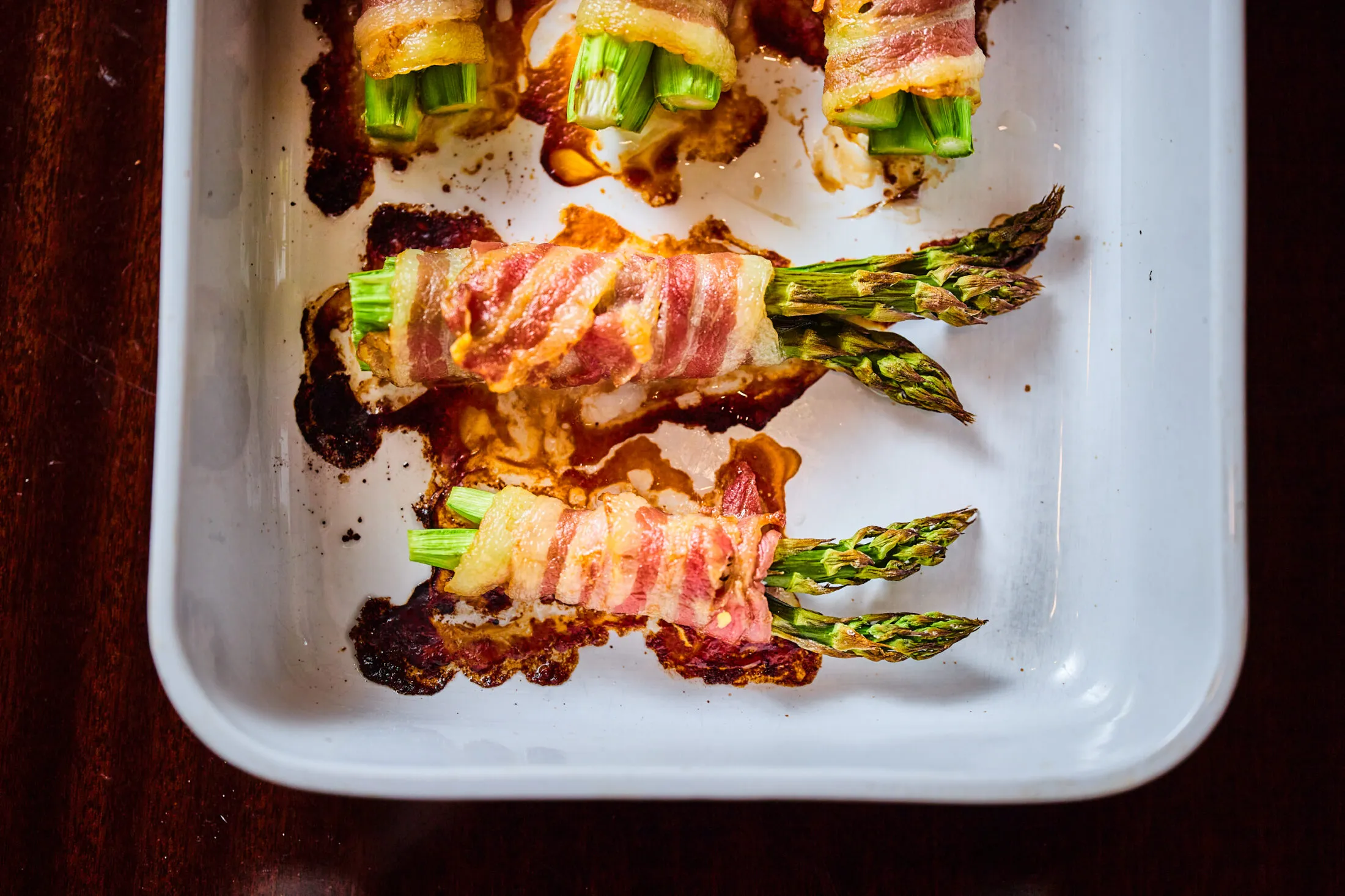 A baconbe tekert spárga elkészítésének első lépéseként a spárga fás részét letörjük ott, ahol engedi, majd bevizezzük és nedvesen megsózzuk. Ezután a spárgaszálakat hármasával összefogjuk és „csokronként” 2-2 szelet baconnel körbetekerjük. Az így kapott kis spárgacsomagokat tepsibe rakjuk, majd betesszük a 200 fokra előmelegített sütőbe 10 percre, és készre sütjük. Magában is fogyaszthatjátok, de simán összedobhattok mellé valamilyen frankó mártogatóst is, hogy jobban csússzon. :)