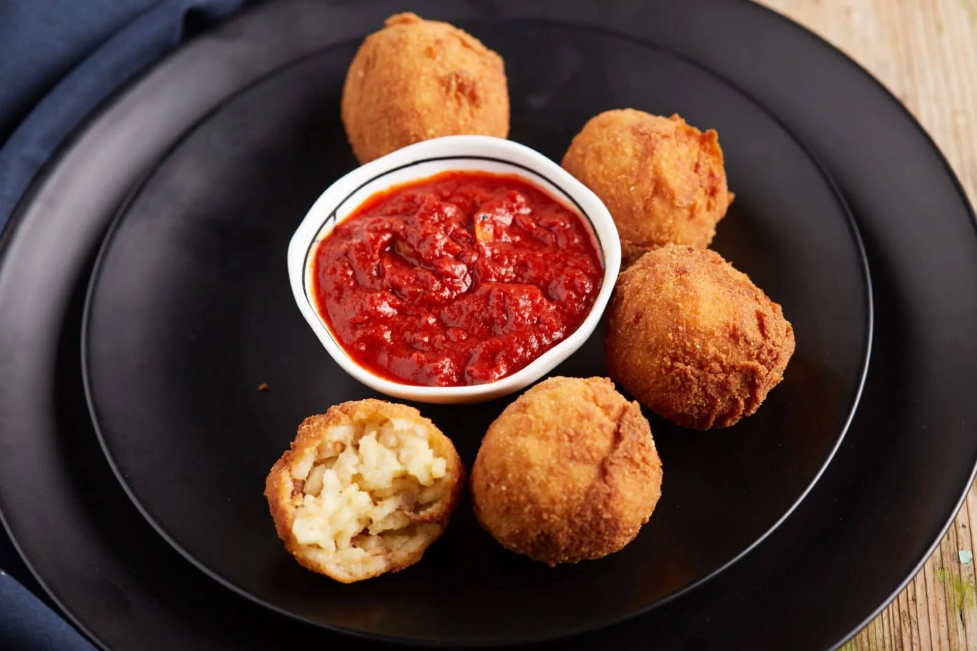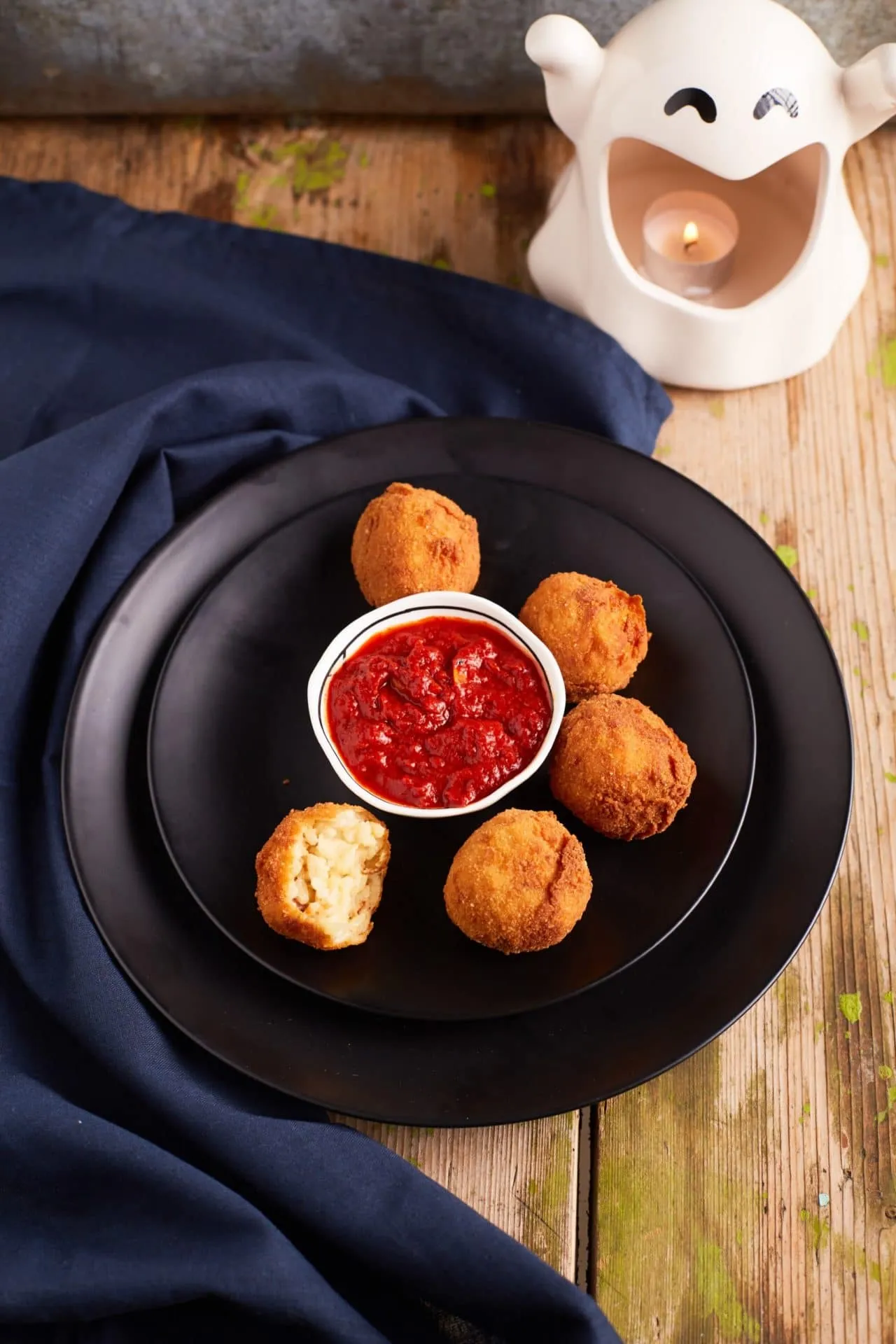 A kihűlt rizottóból golyókat formázunk, és a hagyományos módon bundázzuk: lisztbe, majd egy csipet sóval felvert tojásba, végül zsemlemorzsába forgatjuk, és bő olajban aranybarnára sütjük. Az aranciniket a szósszal tálaljuk.