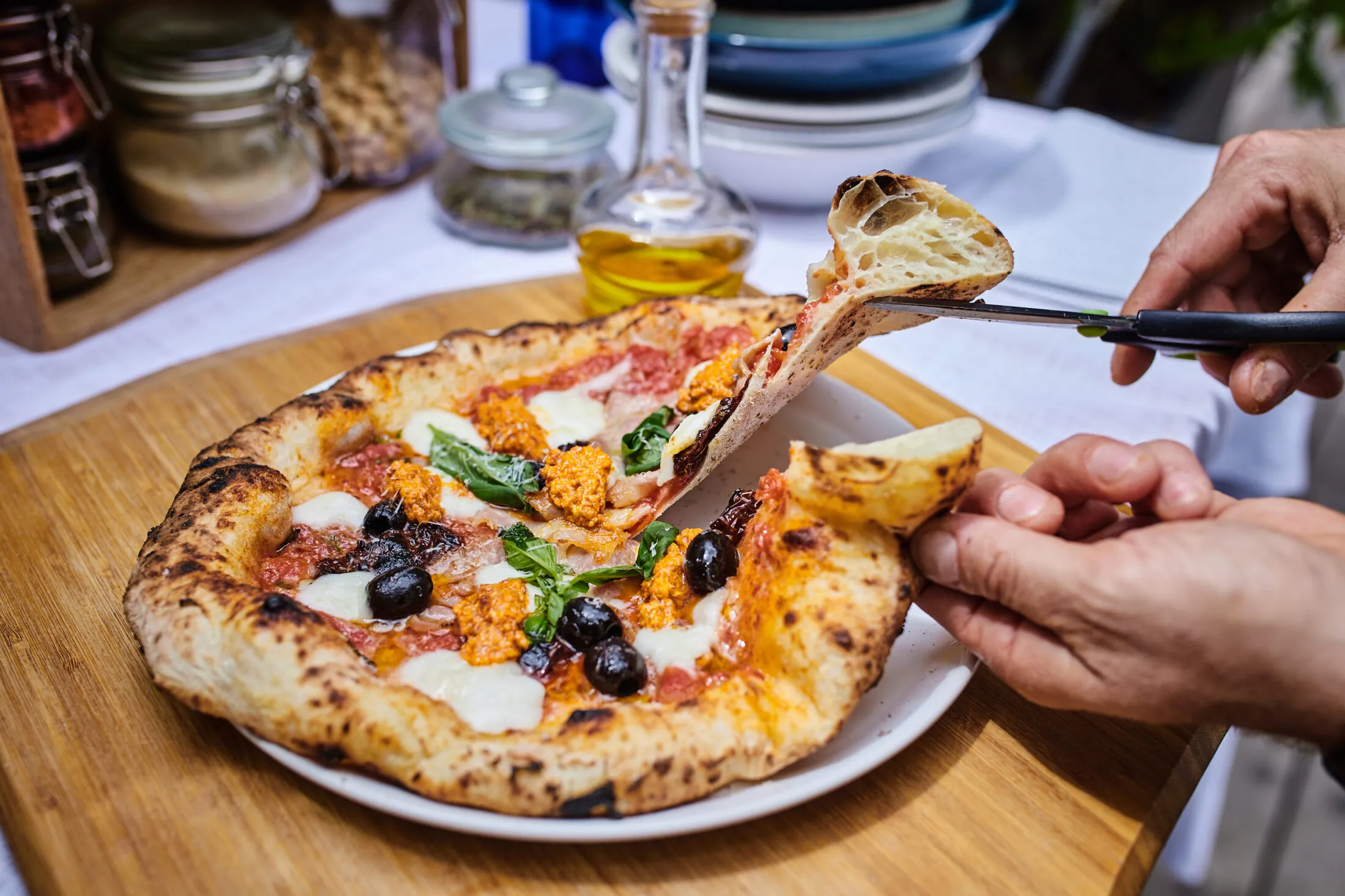 Az előzőleg már elővett tésztát egy spakli segítségével kiemeljük a dobozból és belerakjuk a réteslisztbe. A kezünkkel kerek formára igazítjuk a bucit, majd az ujjainkat összeszorítva elkezdjük a közepétől a perem felé kilapítani a tésztát úgy, hogy közben egy peremet is képezzünk. Majd a kézfejünkre emelve a megfelelő méretűre nyújtjuk a tésztát. (Ez attól is függ, hogy mekkora a sütőterünk.)