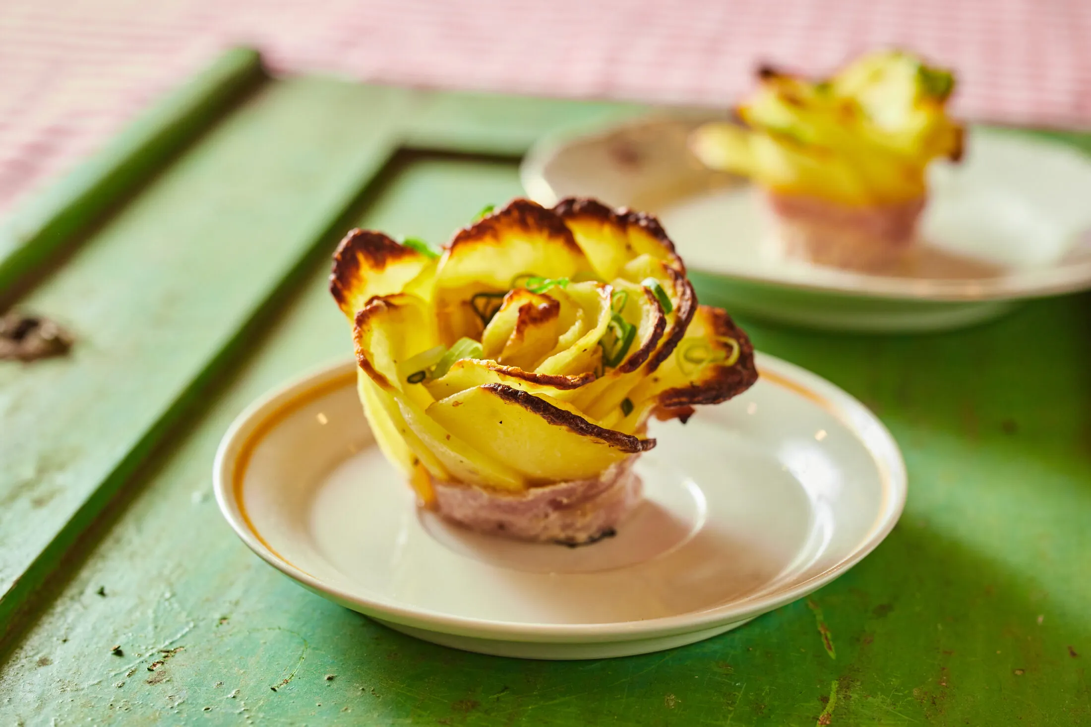 Egy szelet bacont kiterítünk egy deszkára és elkezdjük befedni a végéig burgonyaszeletekkel úgy, hogy azok félig fedjék egymást. Szorosan felgöngyöljük, hogy kiadja a rózsa formát és beleállítjuk egy muffinsütő forma egyik mélyedésébe. Így járunk el az összes bacon- és burgonyaszelettel, amíg el nem fogynak az alapanyagok. Ezután a sütőformát a 180 fokra előmelegített sütőbe rakjuk 20-25 percre, míg ropogósra sül a burgonya. Tálalásnál vékony karikákra vágott újhagymával szórjuk meg.