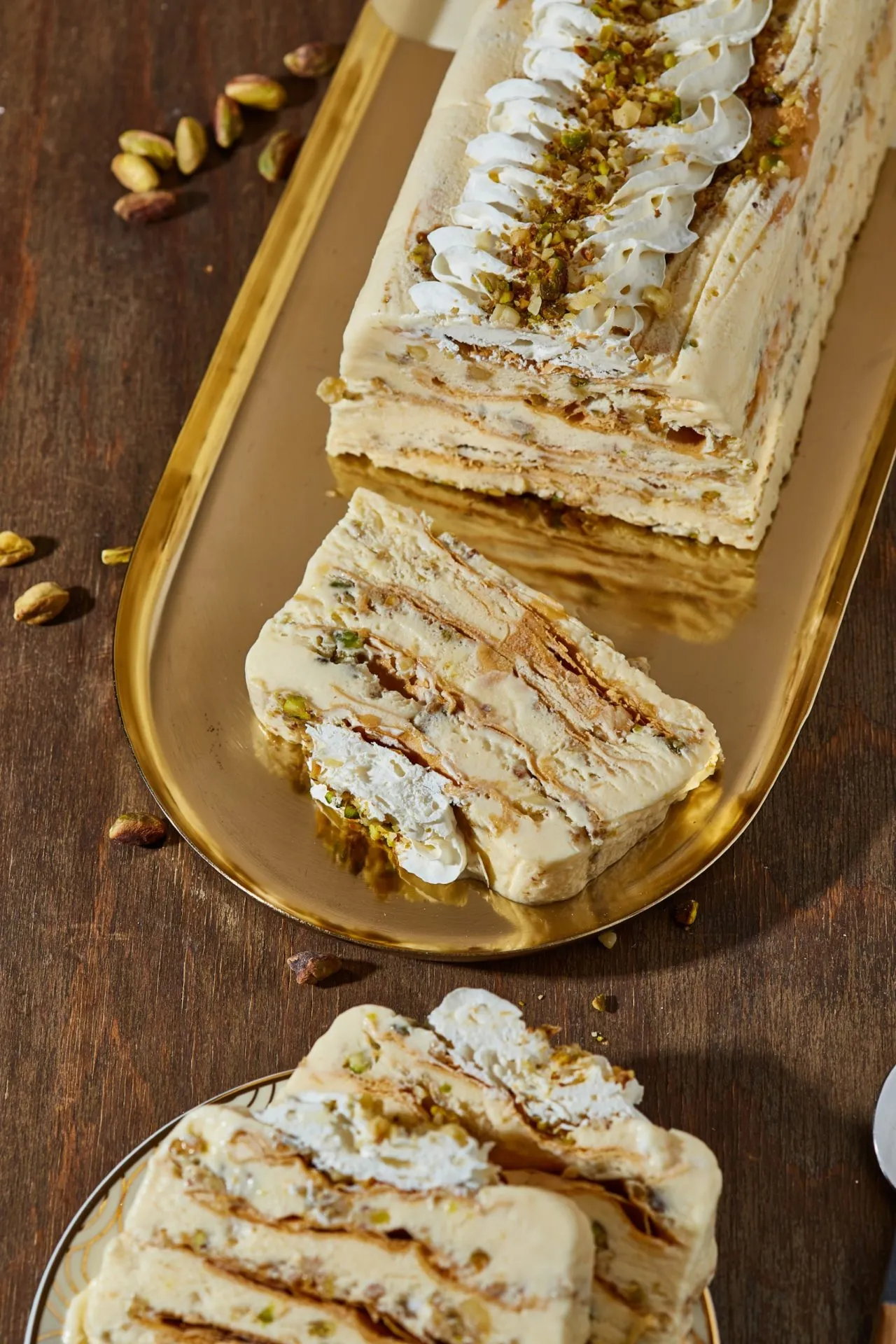 A habtejszínt is kemény habbá verjük, majd összeforgatjuk a vízgőz fölött felolvasztott fehér csokival, valamint a habbá vert fehérjével és sárgájával. Belekeverjük a lepirított magvakat, fél citrom levét és az egész héját, és rétegezzük a megsült réteslapokkal egy fóliával kibélelt formában. Fagyasztóba rakjuk 4-5 órára vagy egy éjszakára.