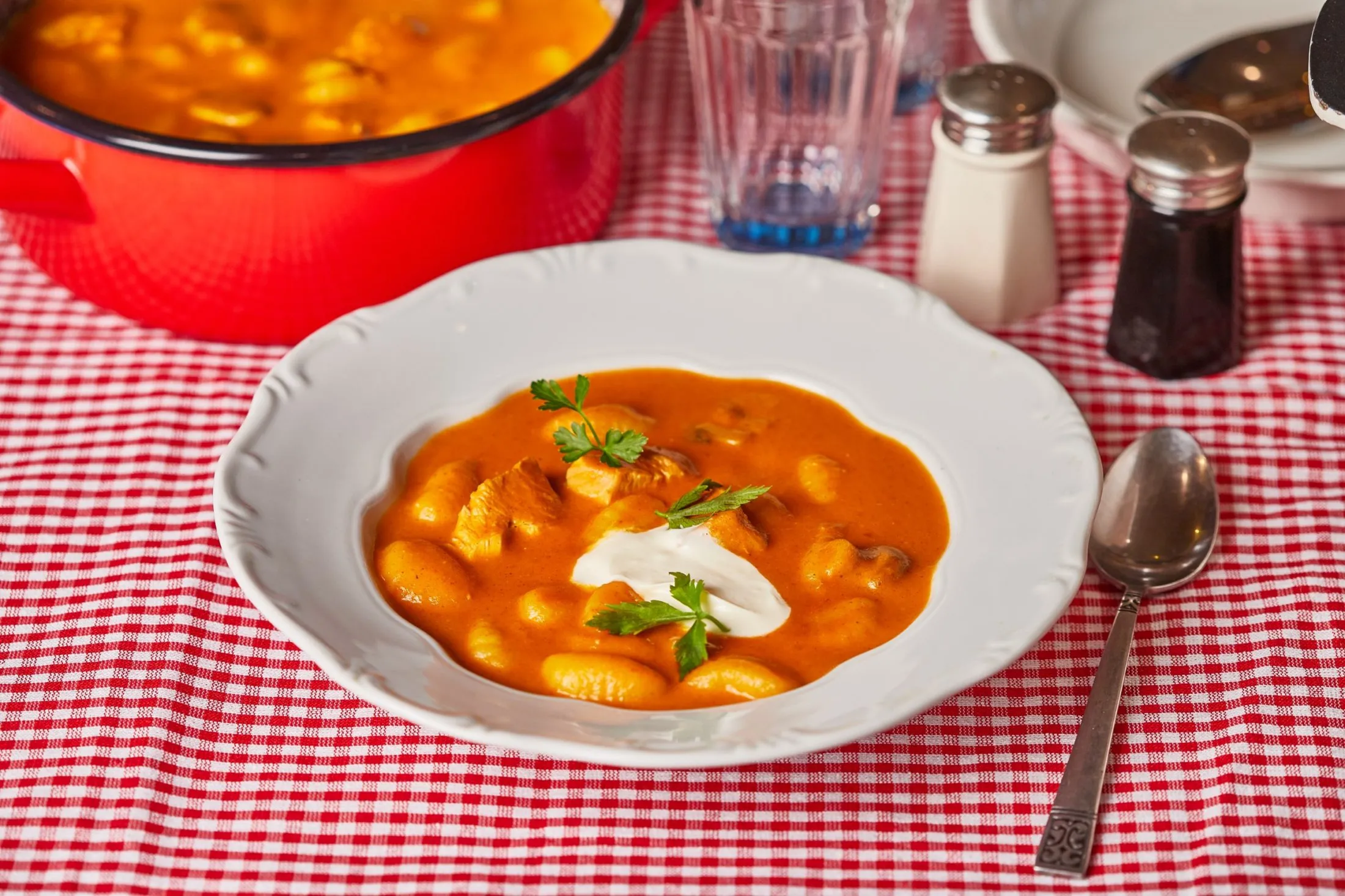 Végül beleszórjuk a gnocchit, és 3-4 perc alatt készre forraljuk. Tejföllel, illetve ízlés szerint savanyúsággal tálaljuk.