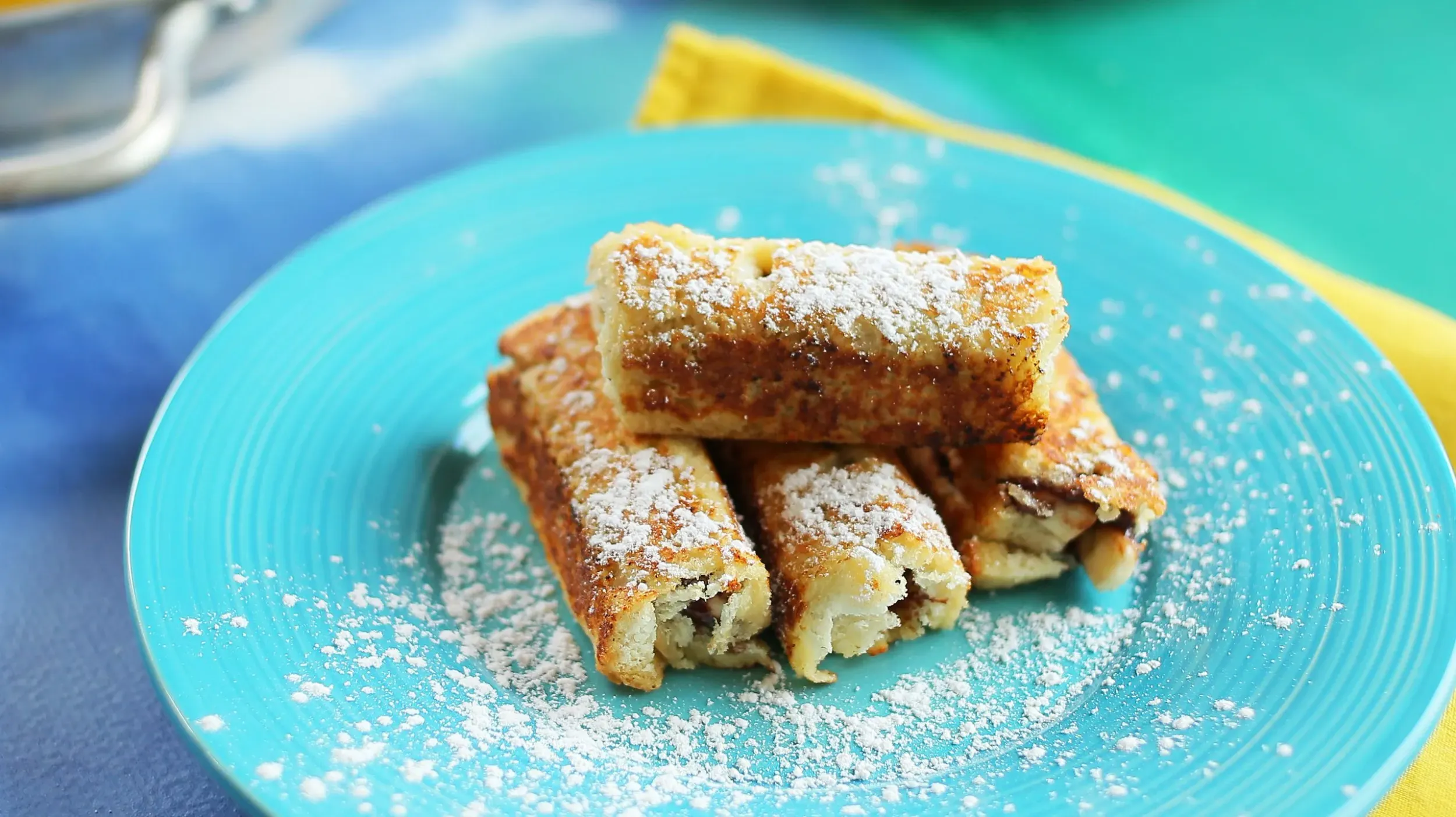 A tojást a tejjel kissé felverjük, a banánt felkockázzuk. A kenyérszeletek széleit levágjuk és a belsejét sodrófával kilapítjuk. Megkenjük az egészet 1 evőkanál mogyorókrémmel és az egyik rövidebb végébe teszünk egy sor banánt és feltekerjük. Az egészet megmártjuk a tojásban, majd a vajas, felhevített serpenyőben aranybarnára sütjük minden oldalukat. Amikor elkészült azonnal megszórjuk porcukorral és még melegen fogyasztjuk.