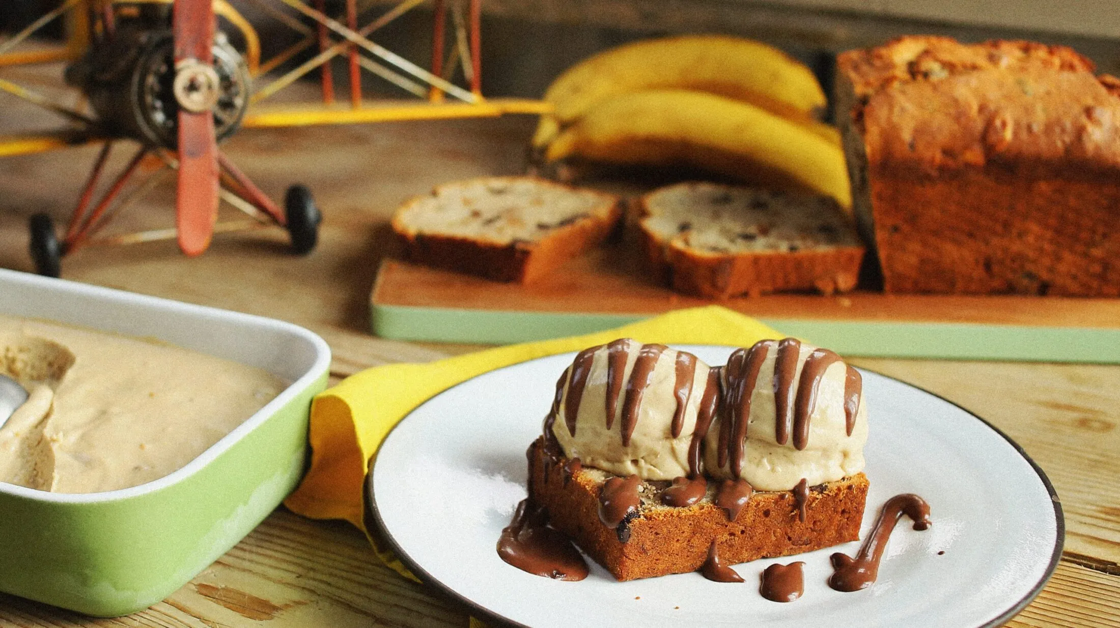 A tojások cukorral és vaníliás cukorral habosra keverjük, hozzáadjuk a joghurtot, a banánokat, és habverőfejjel simára keverjük. Hozzáadjuk a kétféle lisztet, a fahéjat, az őrölt gyömbért, a szegfűszeget, a borsot, sót, a sütőport és elkezdjük összekeverni. Olvasztott vajat csorgatunk bele, és homogén tésztává keverjük. Pirított földimogyoró és darabokra vágott csoki megy még bele, még egyszer összeforgatjuk és mehet a kivajazott formába. 160 fokon kb. 70-80 perc alatt készre sütjük, tűpróbát végzünk rajta.Banánfagyival és Jani csoki szószával tálaljuk.