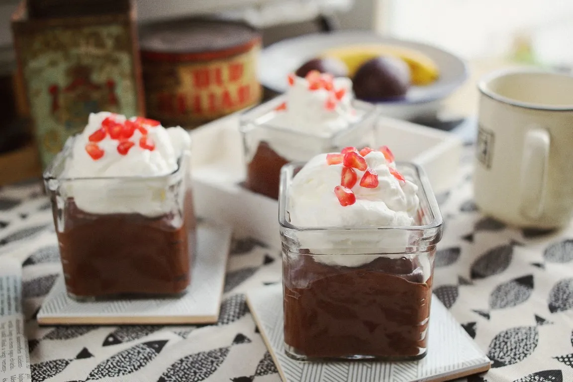 Az avokádót, a banánokat, a kakaóport, a kókusztejet, és a porcukrot botmixerrel addig turmixoljuk, amíg igazi csokipuding állagú nem lesz. Kiszedjük kis tálkákba és a tetejére tejszínhabot kanalazunk, amit gránátalmával szórunk meg.