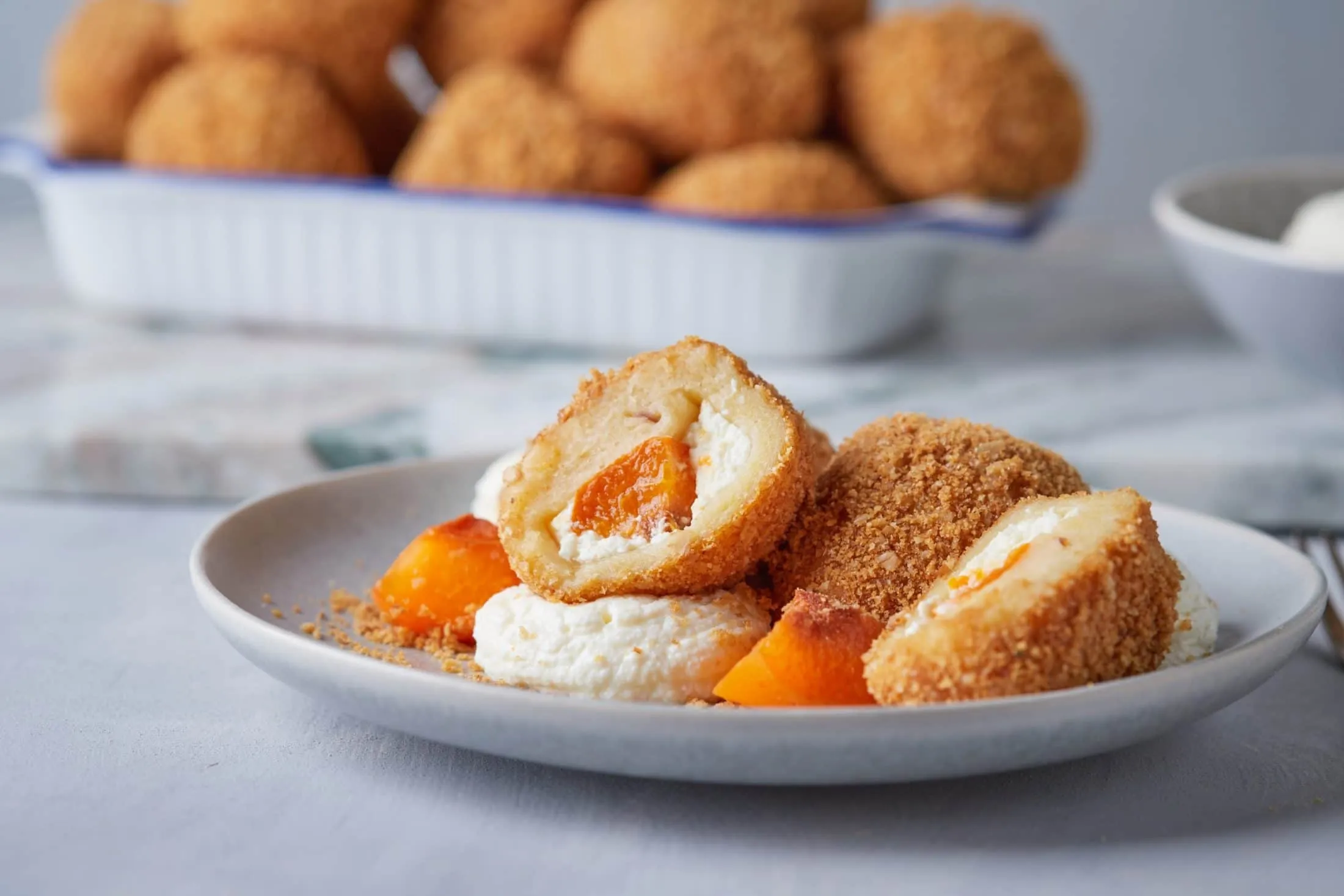 Barackos-túrókrémes gombóc zabkekszmorzsában
