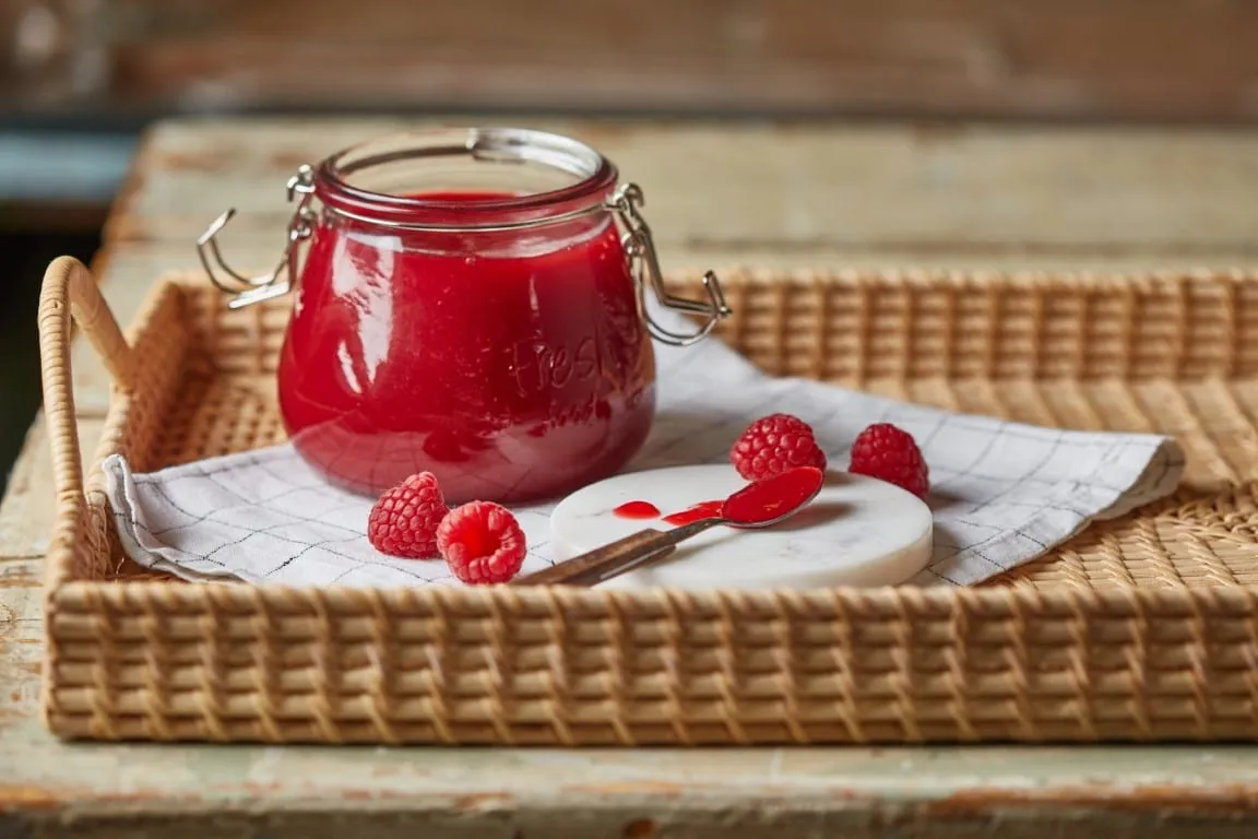 A málnát megmossuk, és egy lábasba rakjuk a cukorral, a citrom kifacsart levével és lereszelt héjával együtt. 7-8 percig rotyogtatjuk, majd beledobjuk a bazsalikomleveleket, és leturmixoljuk.