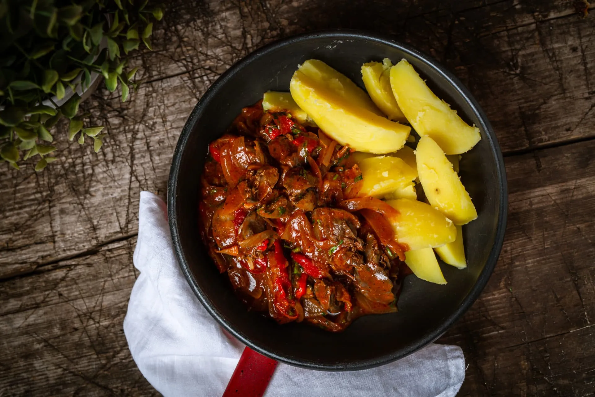 A hagymát és a fokhagymát felszeleteljük, majd a forró olajon 4-5 percig pirítjuk. Maximumra kapcsoljuk a hőmérsékletet, és rádobjuk a májat, majd 2-3 perc pirítás után rádobjuk a fűszereket, gyorsan elkeverjük, felöntjük a fehérborral, majd a negyedére forraljuk. Ráöntjük a lecsót, ízlés szerint sózzuk, borsozzuk, majd addig rotyogtatjuk lassú tűzön, ameddig a máj teljesen át nem főtt, de nem szárad ki (kb. 10 perc). Megszórjuk aprított petrezselyemmel, és főtt burgonyával vagy egyéb, tetszőleges körettel fogyasztjuk.
