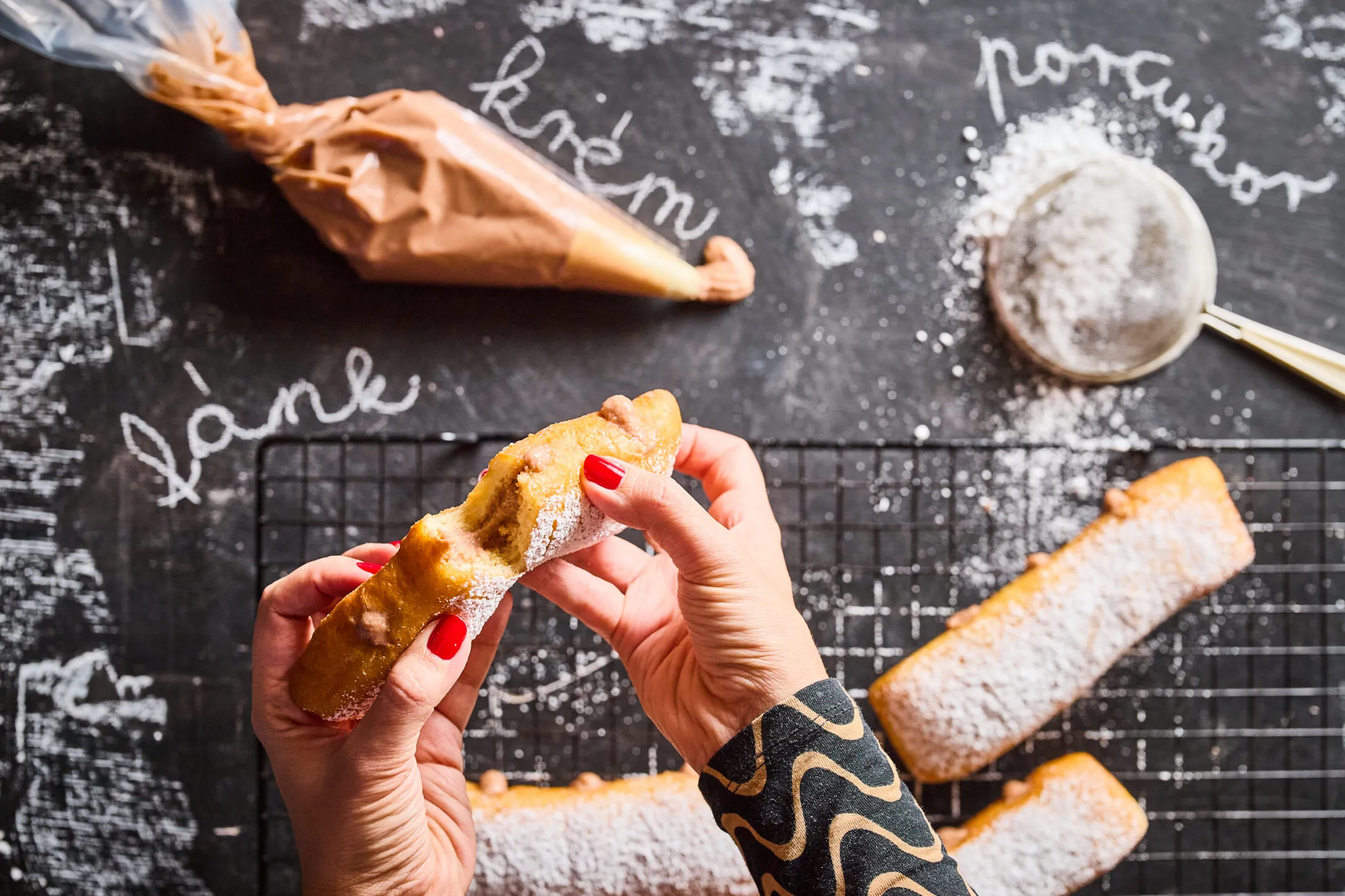 A kihűlt fánkok oldalába 2-3 kisebb lyukat szúrunk, majd habzsákból, a lyukakon keresztül megtöltjük a fánkokat. Kevés porcukorral megszórjuk, és készen is vagyunk.
