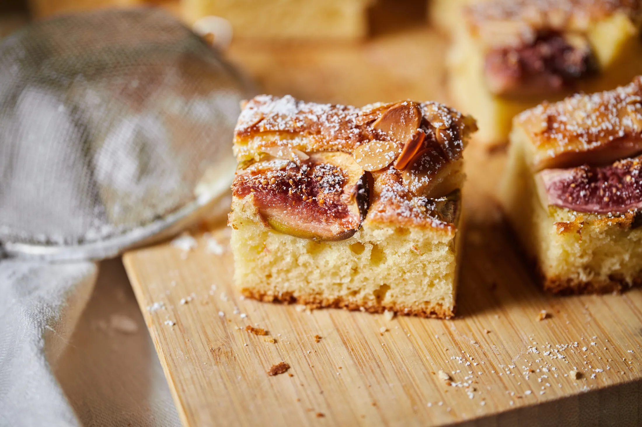 Olajjal vékonyan átkent, majd kilisztezett tepsibe simítjuk a tésztát és a tetejére pakoljuk a negyedekbe vágott fügéket. Megszórjuk mandulaforgáccsal, és 180 fokra előmelegített sütőben 40 perc alatt készre sütjük a sütit. Mikor kihűlt, felszeleteljük és porcukorral megszórva tálaljuk.