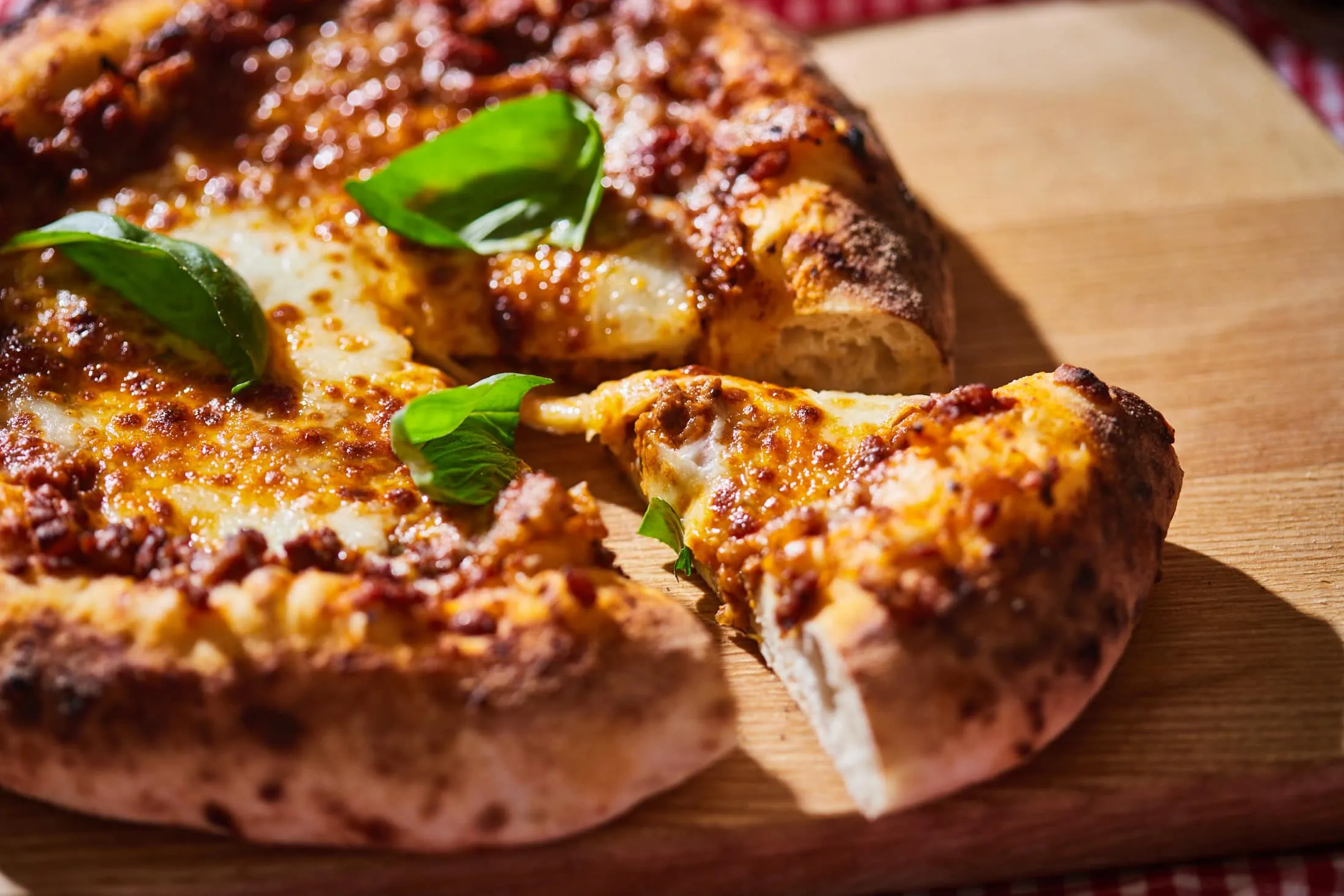 A tésztát kukoricaliszttel enyhén megszórt felületen kb. 20 centisre nyújtjuk. Rákanalazzuk a ragut, megszórjuk a reszelt sajttal, rátépkedjük a vizes mozzarellát, és a 400-450 fokos sütőben, 30 másodpercenként negyedet fordítva rajta, készre sütjük. Ha esetleg nincs ilyen sütőnk, akkor 230 fokos sütőbe tesszük a pizzát, és 12-14 perc alatt megsütjük. Tálaláskor friss bazsalikommal megszórjuk.