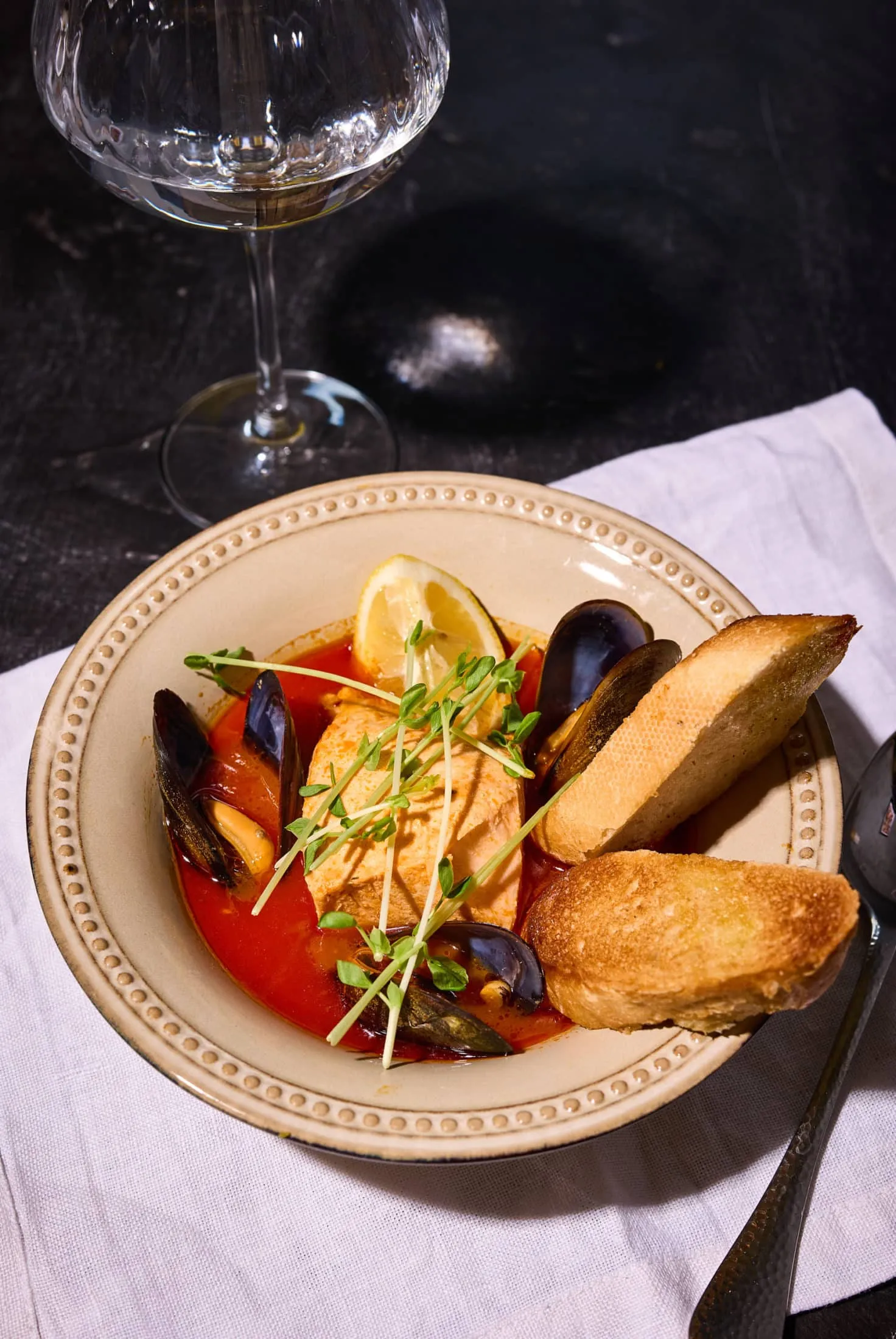 Amikor felforrt, hozzáadjuk a szeklicét, sózzuk, borsozzuk, és közepes lángon kb. 30 percig főzzük. Amikor letelt az idő, leszűrjük. Ne sajnáljuk a szűrőben alaposan átnyomkodni a hozzávalókat, hogy minél több íz kijöjjön belőlük. A leszűrt levet visszatesszük a főzőlapra, beletesszük a megformázott halakat és további 5 perc főzés után a kagylót is. Ha nem konyhakész kagylóval dolgozunk, akkor megvárjuk, míg a kagylók kinyílnak, és hozzáadjuk a vajat, a tejszínt, belefacsarjuk a citrom levét, egyet forralunk rajta és lekapcsoljuk a tűzhelyet. A bagettszeleteket megpirítjuk, és az étel mellé tálaljuk a citromgerezddel és a csírával együtt.