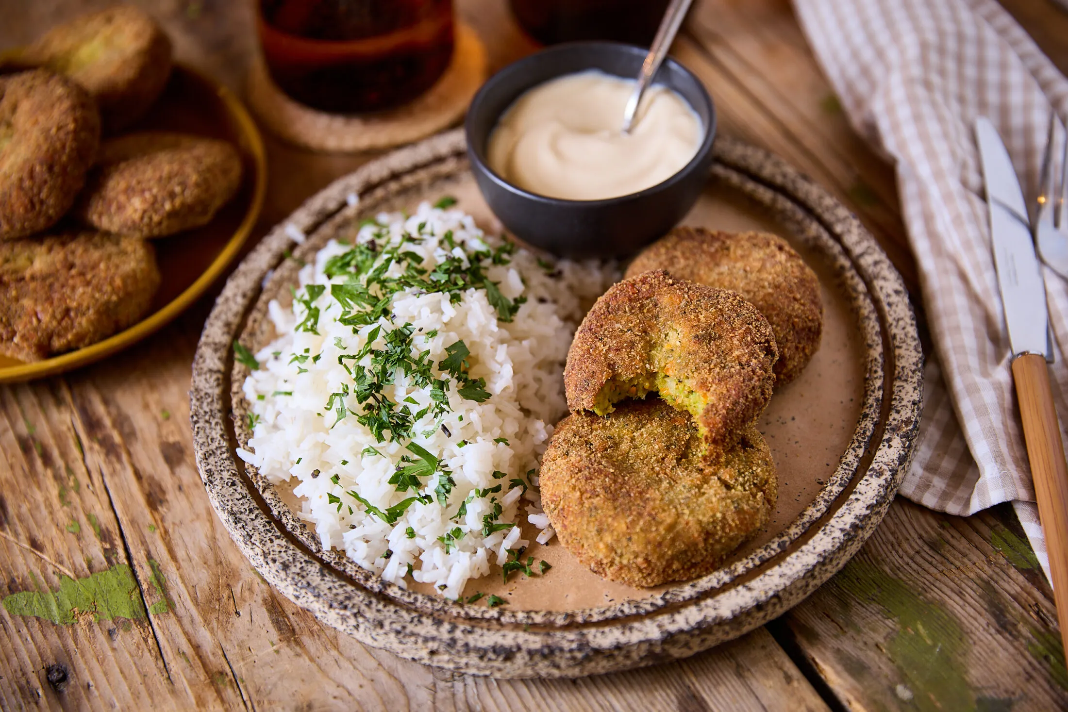 Az olajat egy serpenyőben kb. 170 fokra melegítjük, és oldalanként nagyjából 2 perc alatt kisütjük a fasírtokat. Petrezselymes rizzsel és majonézzel tálaljuk.