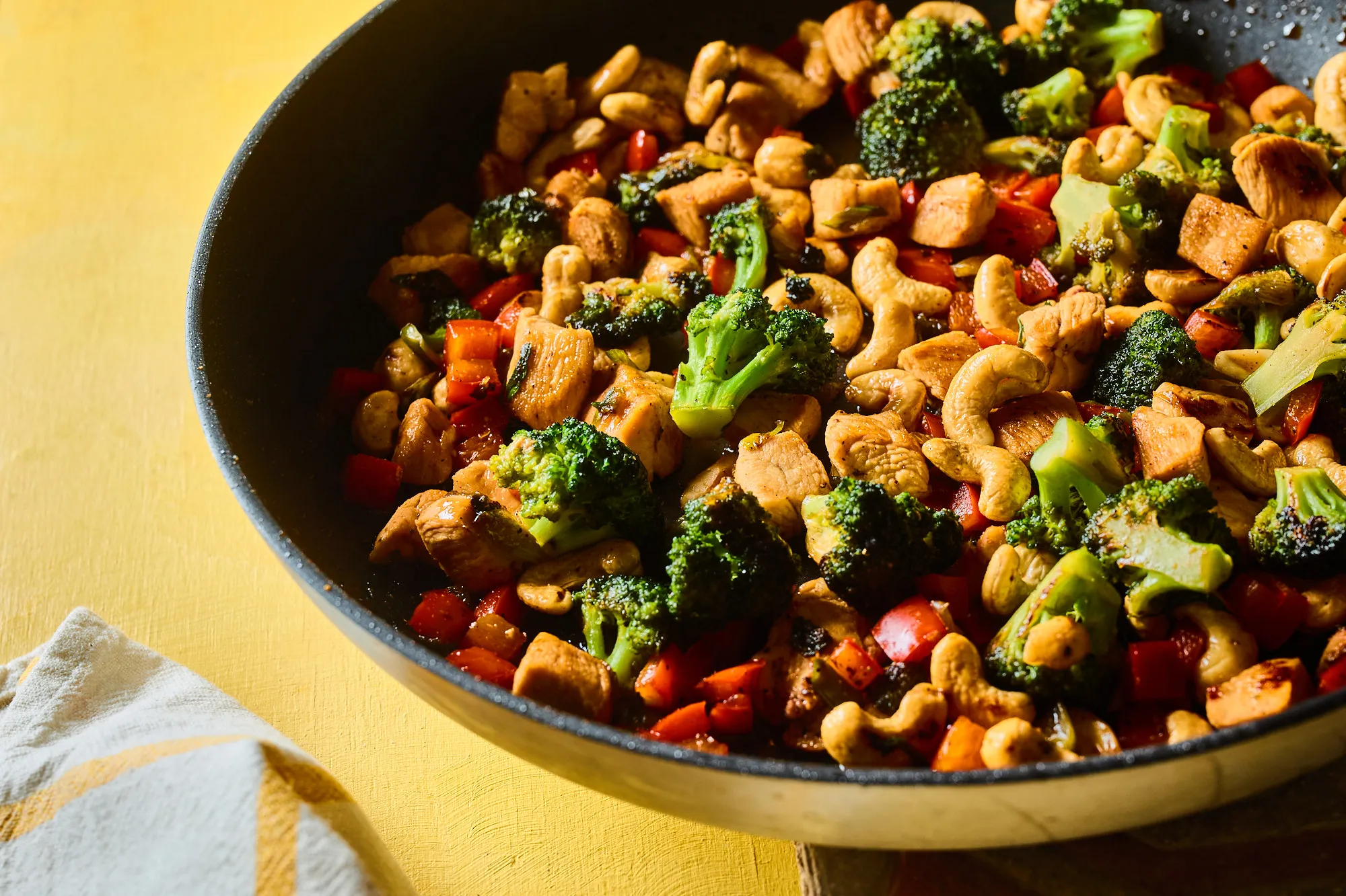 A csirkemellet kisebb kockákra vágjuk, sózzuk, borsozzuk és kevés olajon, megpirítjuk. Az apróra szedett brokkolirózsákat a serpenyőbe rakjuk, a csirke mellé. A kaliforniai paprikát kis kockákra vágjuk, az újhagymát felszeleteljük és a serpenyőbe dobjuk. 4-5 percig pároljuk még őket, majd hozzádobjuk a kesudiót is. Még kb. 2 percig pirítjuk. Közben az öntet hozzávalóit összekeverjük, a serpenyőbe öntjük, kicsit összeforgatjuk és tálaljuk.